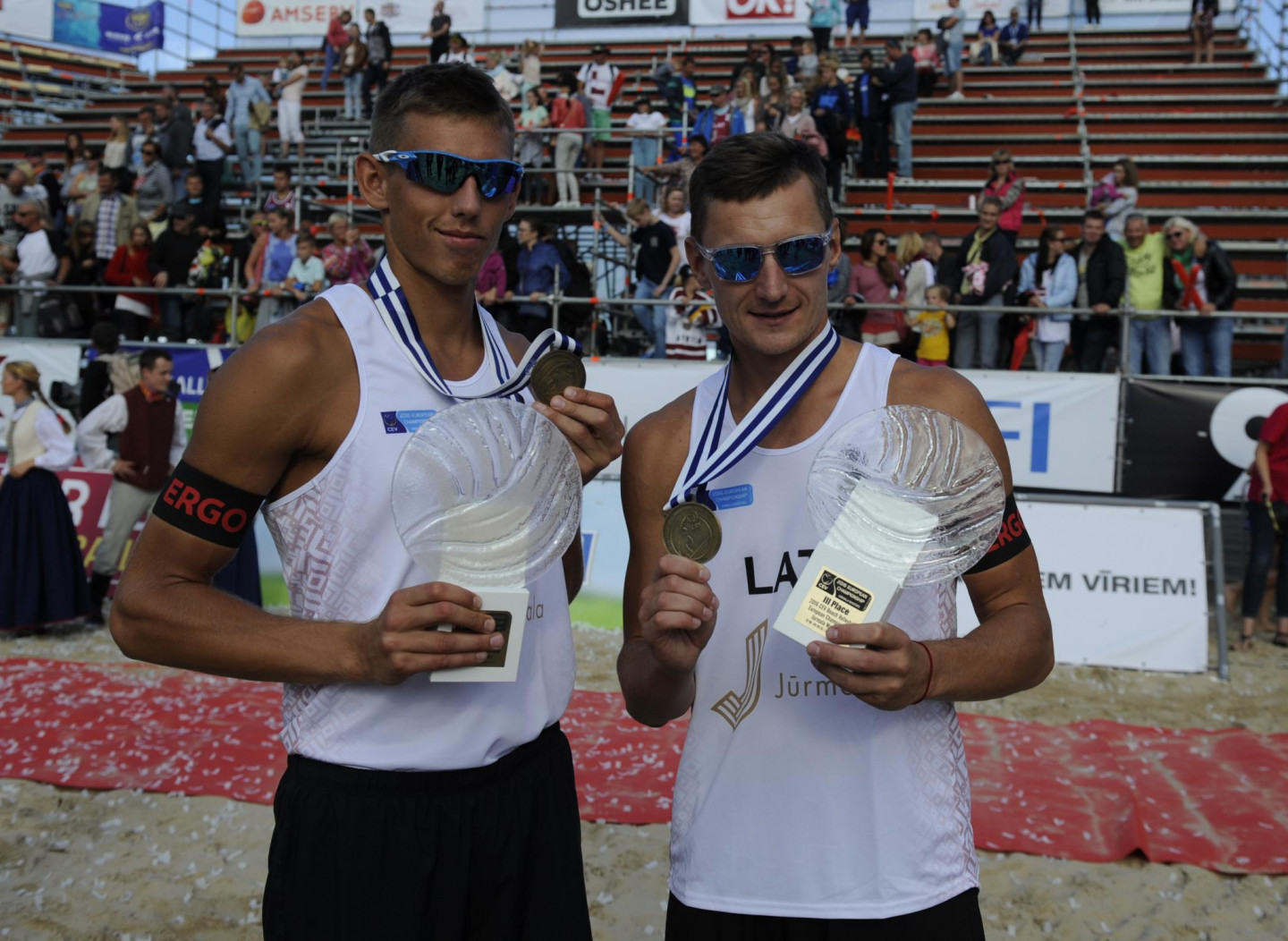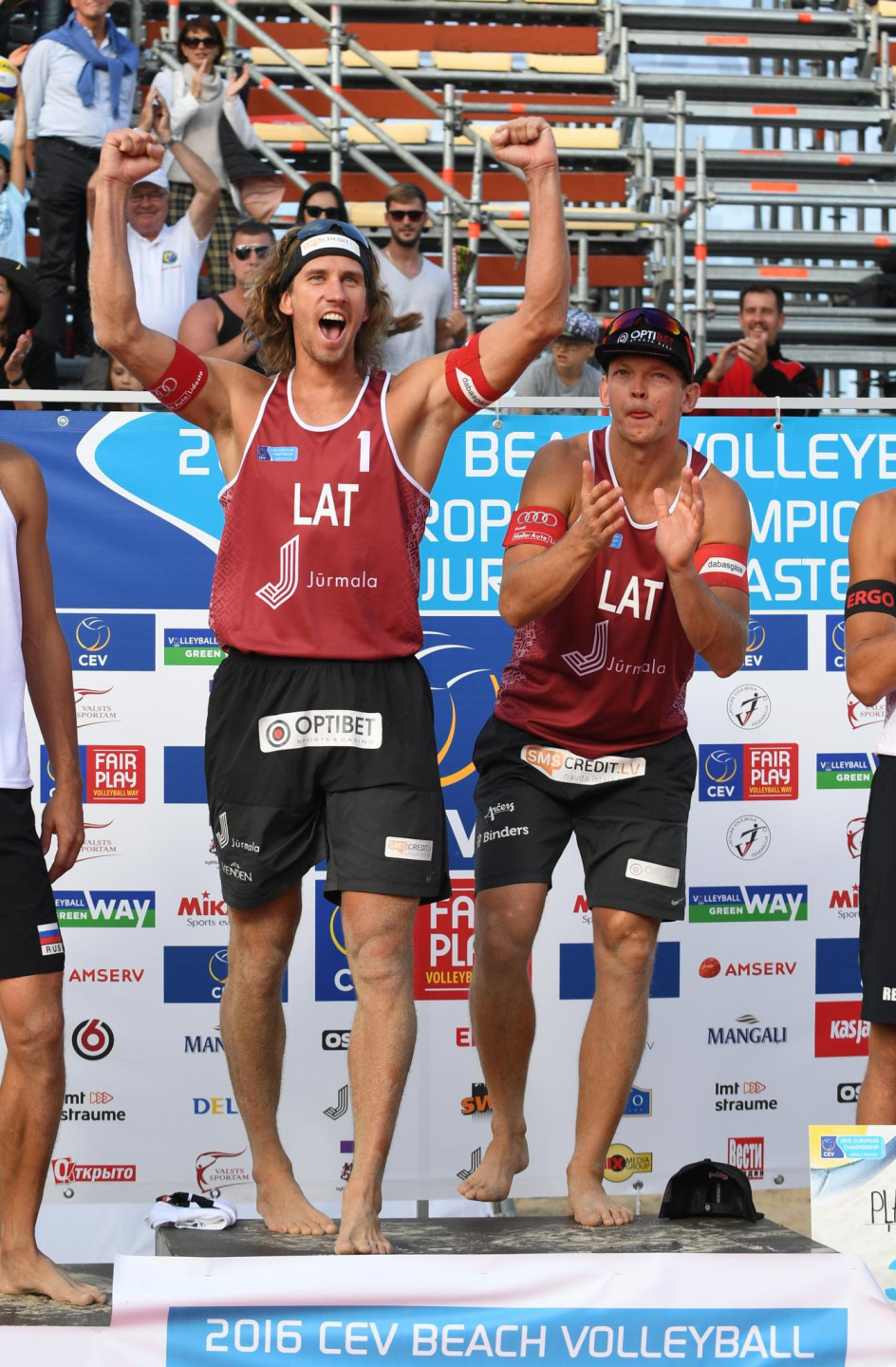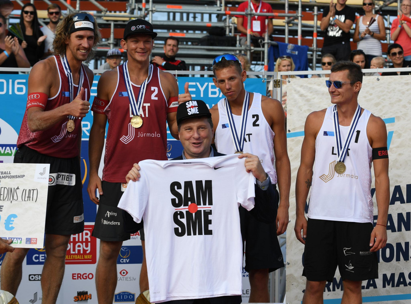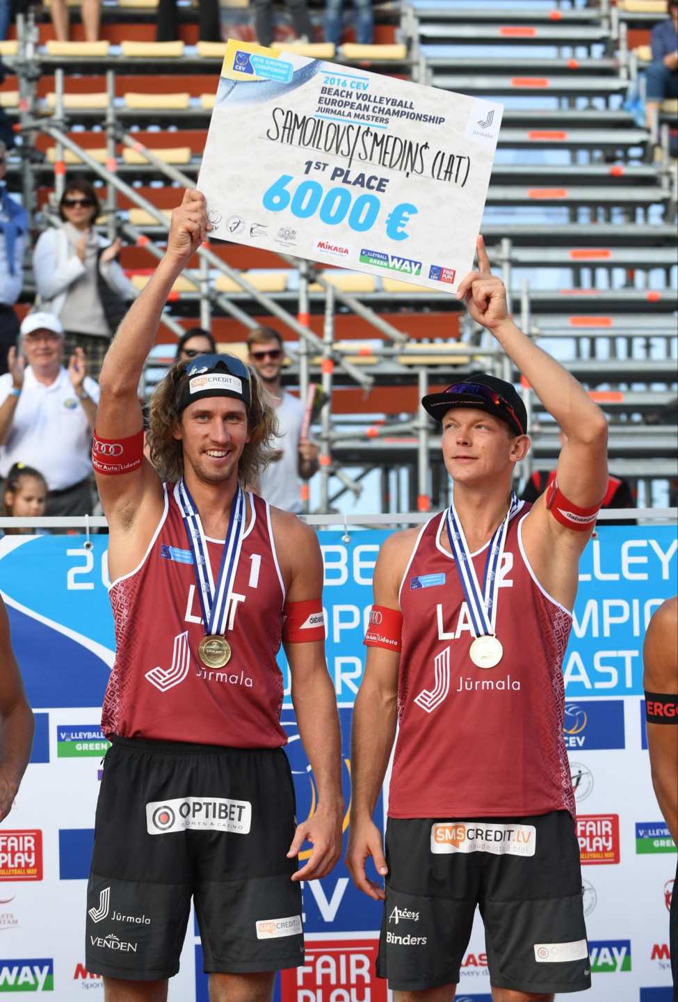 Latvijas pludmales volejbola duets Aleksandrs Samoilovs un Jānis Šmēdiņš svētdien triumfēja Eiropas čempionāta Jūrmalas "Masters" posma finālā, trijos setos apspēlējot krievu duetu Jaroslavu Koškarjovu un Ruslanu Bikanovu. Savukārt Mārtiņš Pļaviņš un Haralds Regža izcīnīja bronzas godalgas.