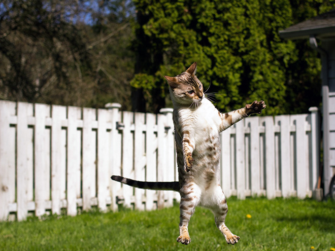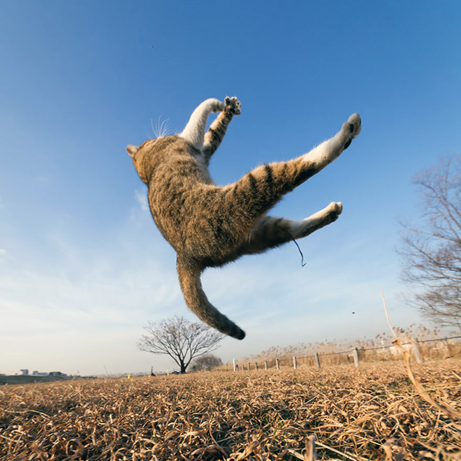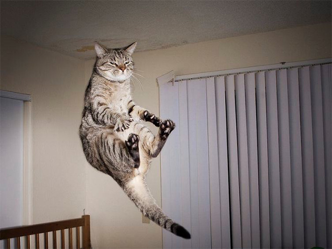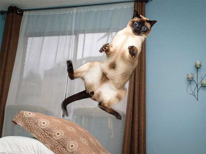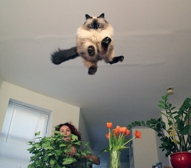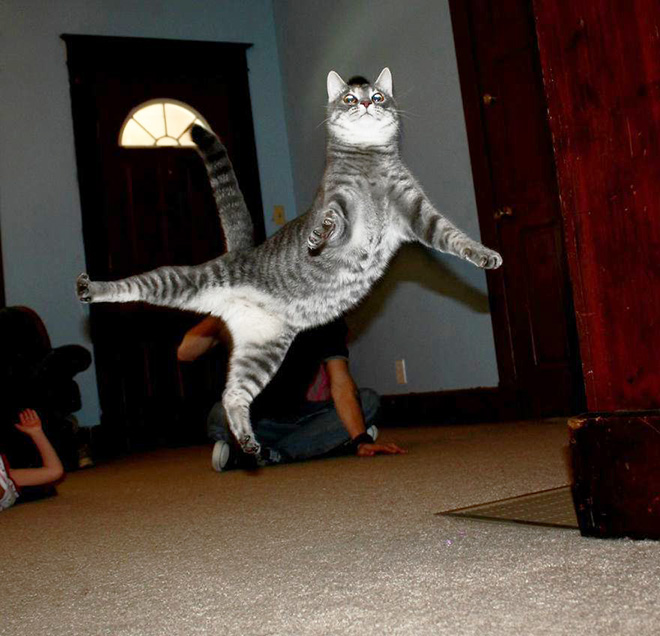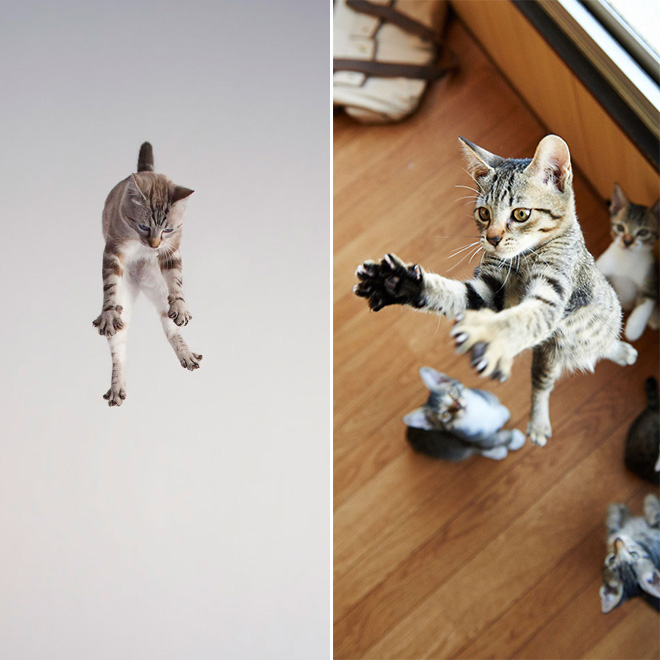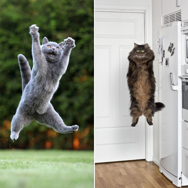 Bieži vien kaķi iekārtojās dažādās interesantās un pat dīvainās pozās. Vēl interesantākas šīs pozas izskatās, kad kāds nofotografē kaķus lēcienā. Tādā gadījumā tie izskatās tā, it kā tos būtu pārņēmis kāds mistisks spēks.