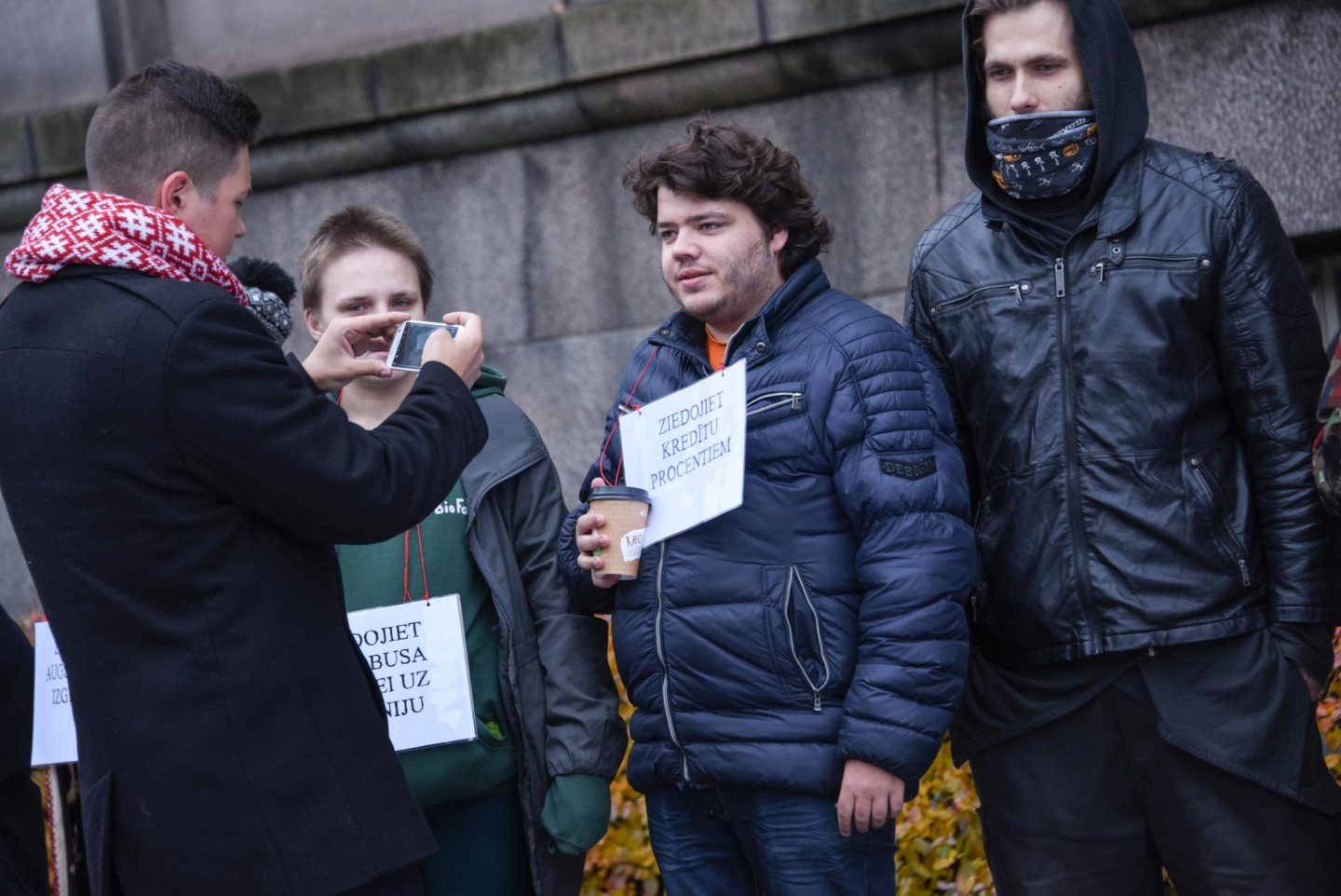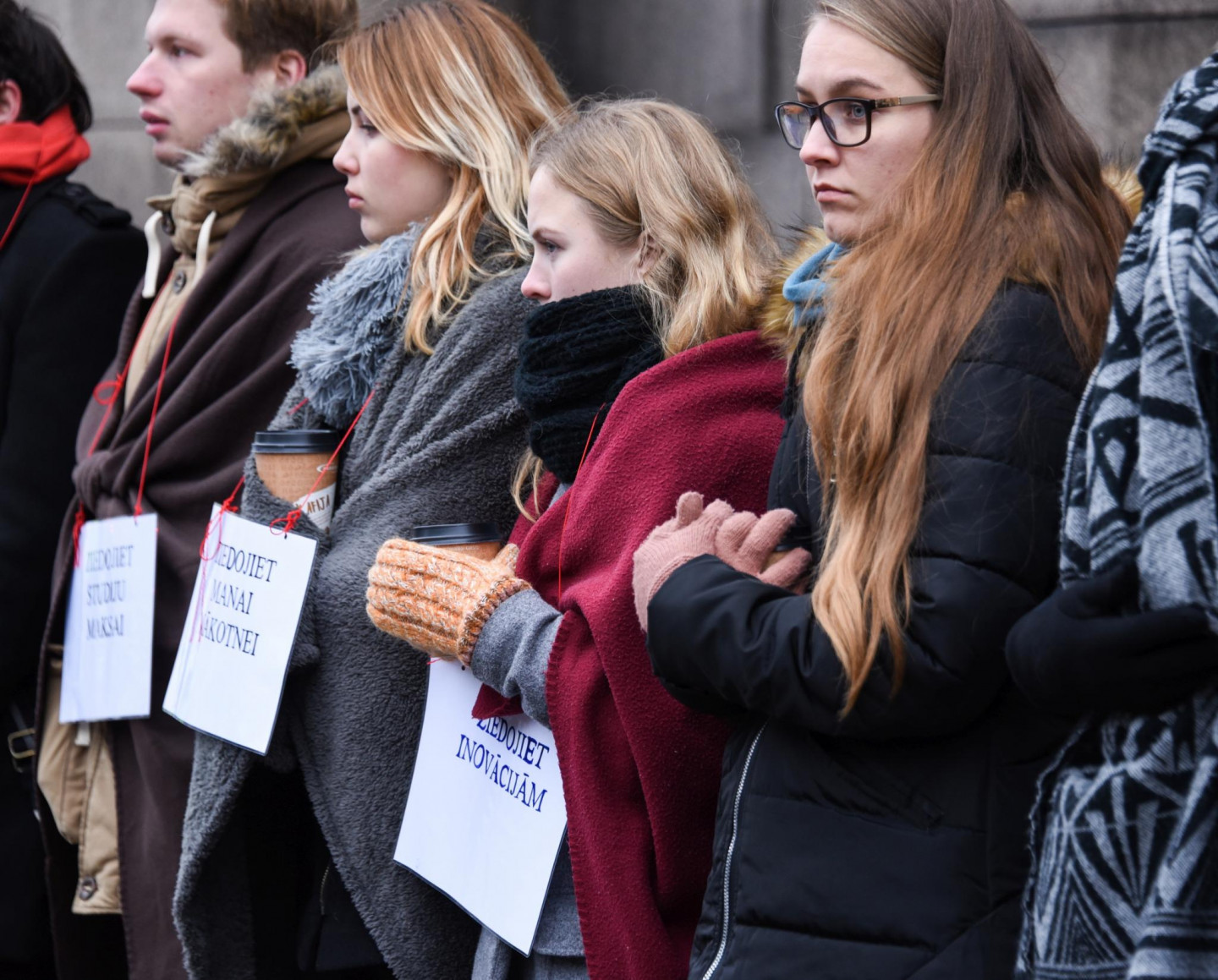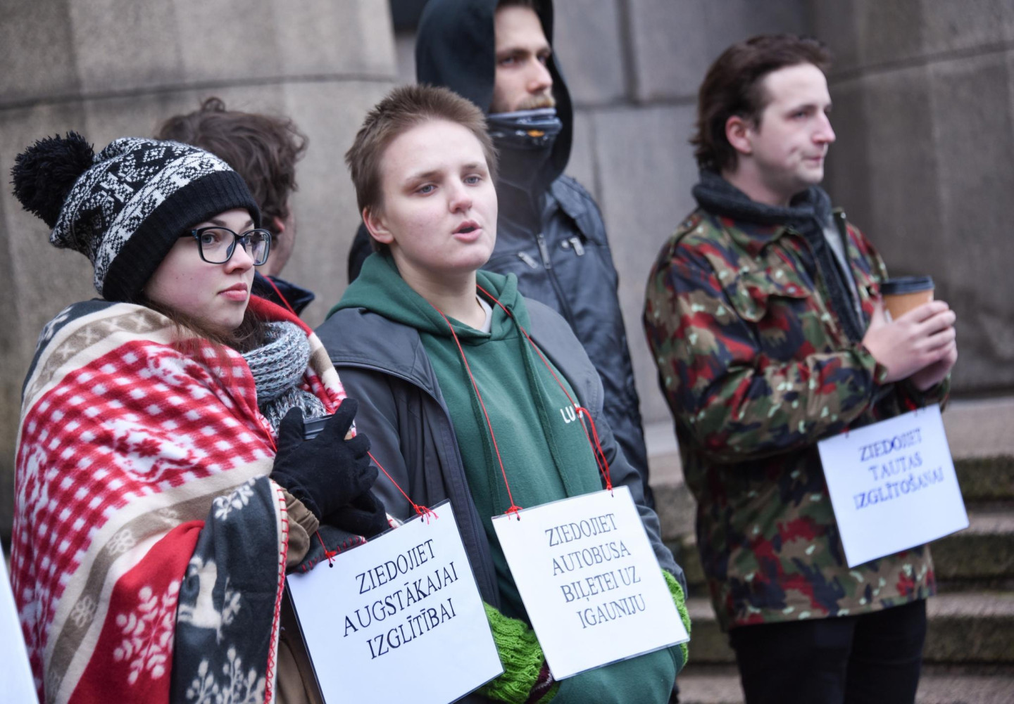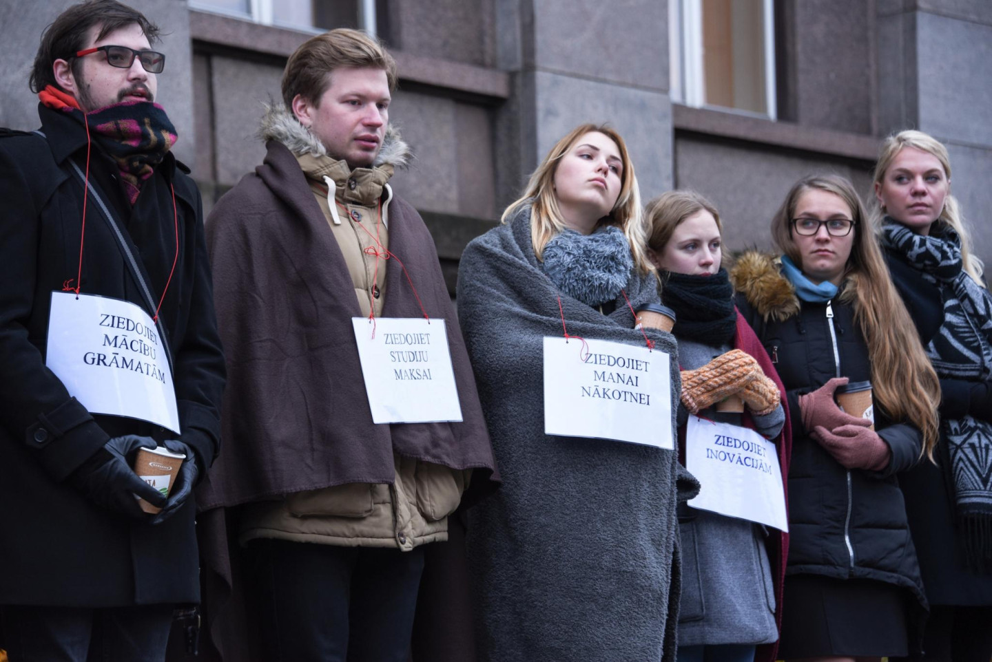 Grabinot kartona kafijas krūzītes, studenti šodien zibakcijā pie Ministru kabineta "lūdza ziedojumus" studijām un protestēja pret plānoto budžeta vietu skaita samazināšanu, vēsta ziņu aģentūra LETA.