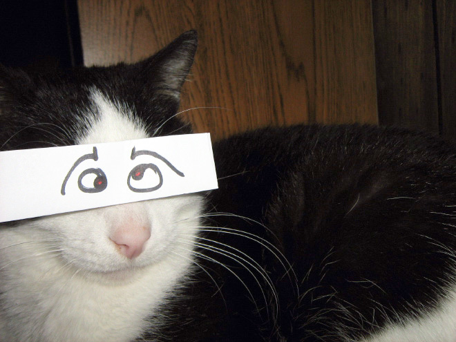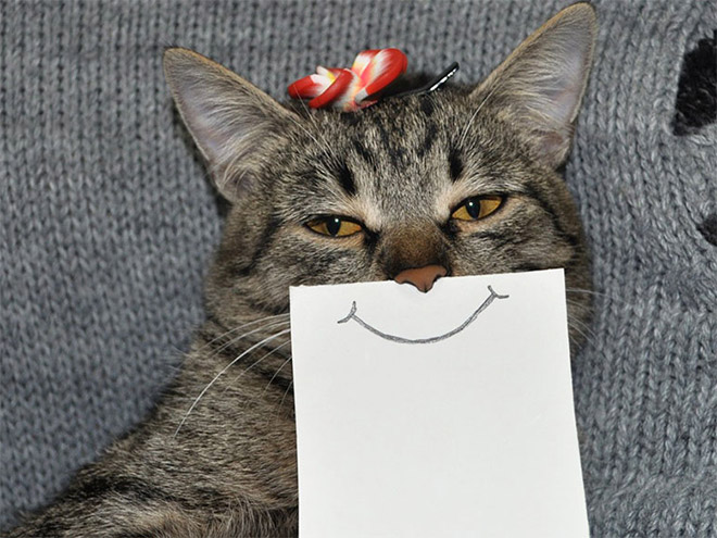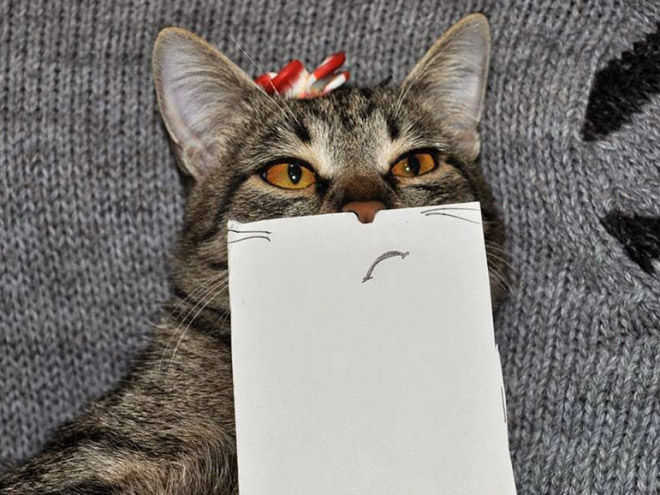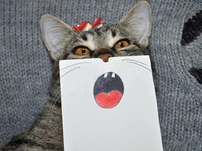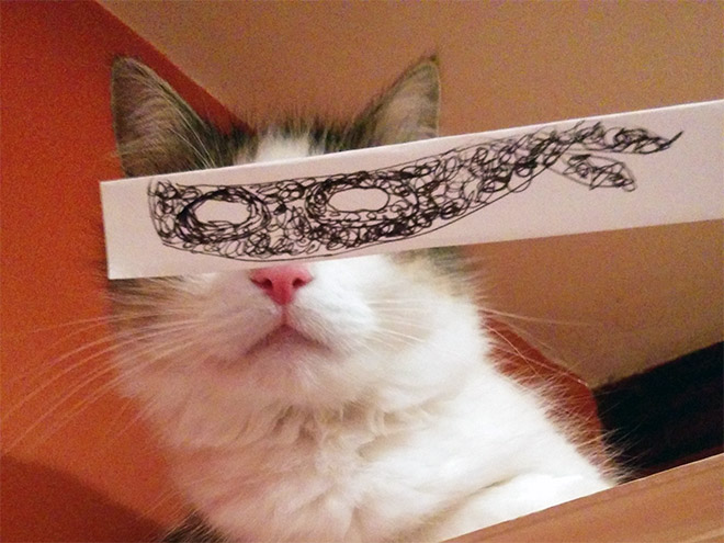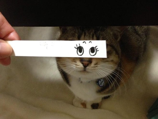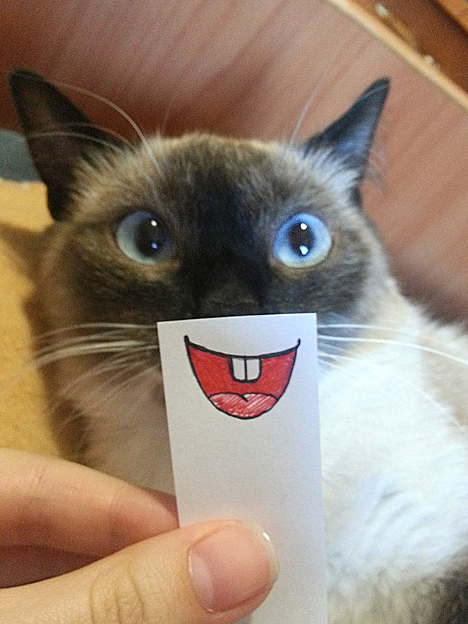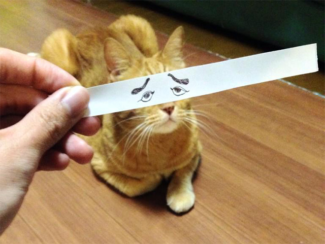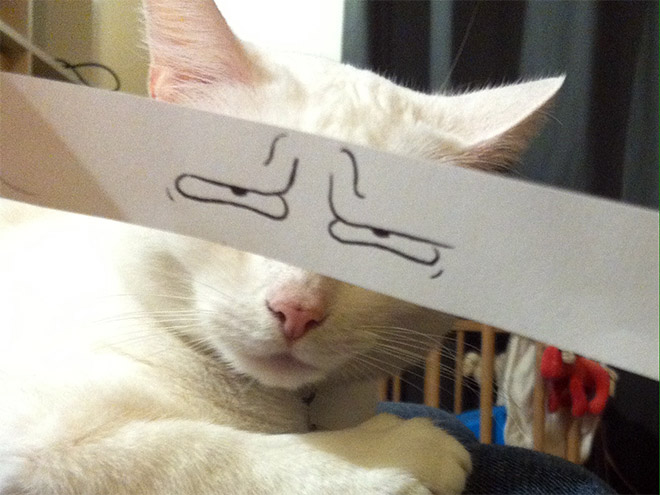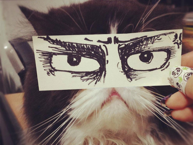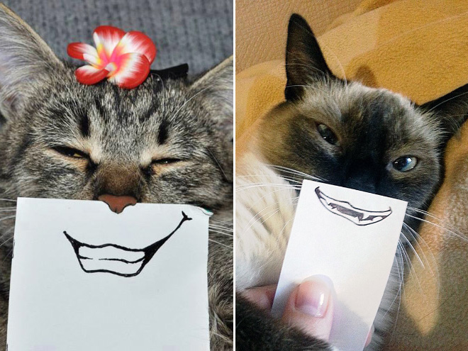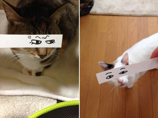 Nereti kaķu saimnieki nolemj nedaudz paspēlēties ar savu mīluli un ar šīm rotaļām raisīt smaidu arī citu cilvēku sejās. Arī šo kaķu saimnieki tā ir darījuši, un ar uzzīmētām acīm vai mutēm "uzlabo" savu mīluļu purniņa izteiksmi.