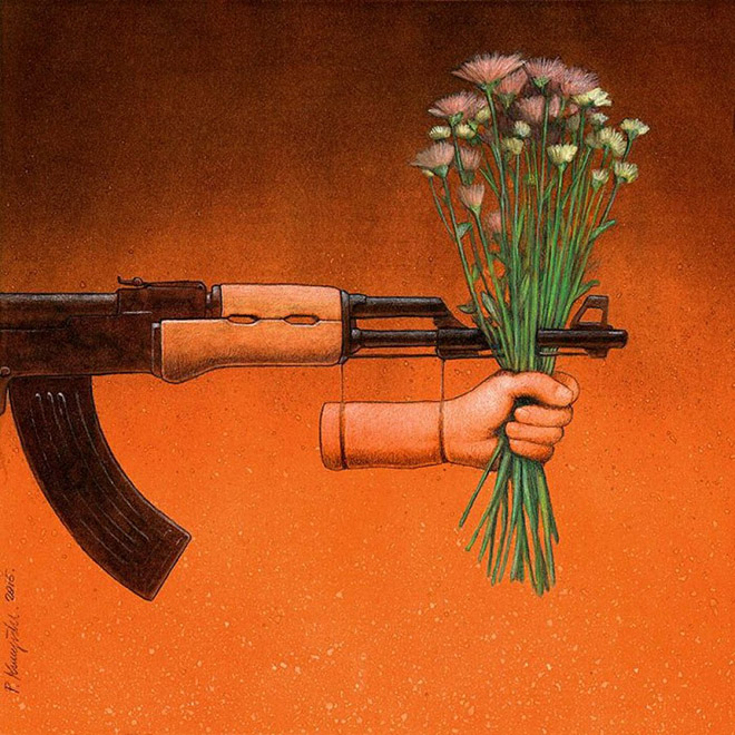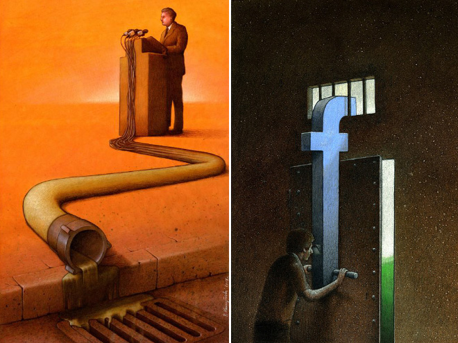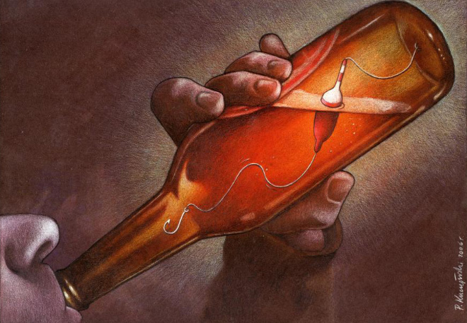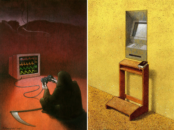 Poļu mākslinieks Pāvels Kučžinskis ar savām ilustrācijām vēlas pievērst sabiedrības uzmanību mūsdienu pasaulē notiekošajam, par ko ikdienā, iespējams, neaizdomājamies.