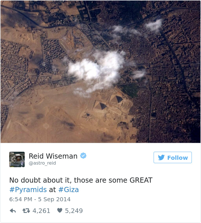 Tikai nelielai cilvēces daļai šobrīd ir iespēja doties visumā un vērot mūsu Zemi no citas perspektīvas. Astronautiem tas ir darbs. Astronauts Reids Vizmens savā twitter.com profilā regulāri publicē fotoattēlus no kosmosa, lai arī mēs varētu zināt, kā Zeme izskatās no visuma.