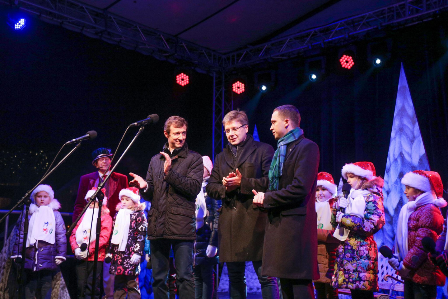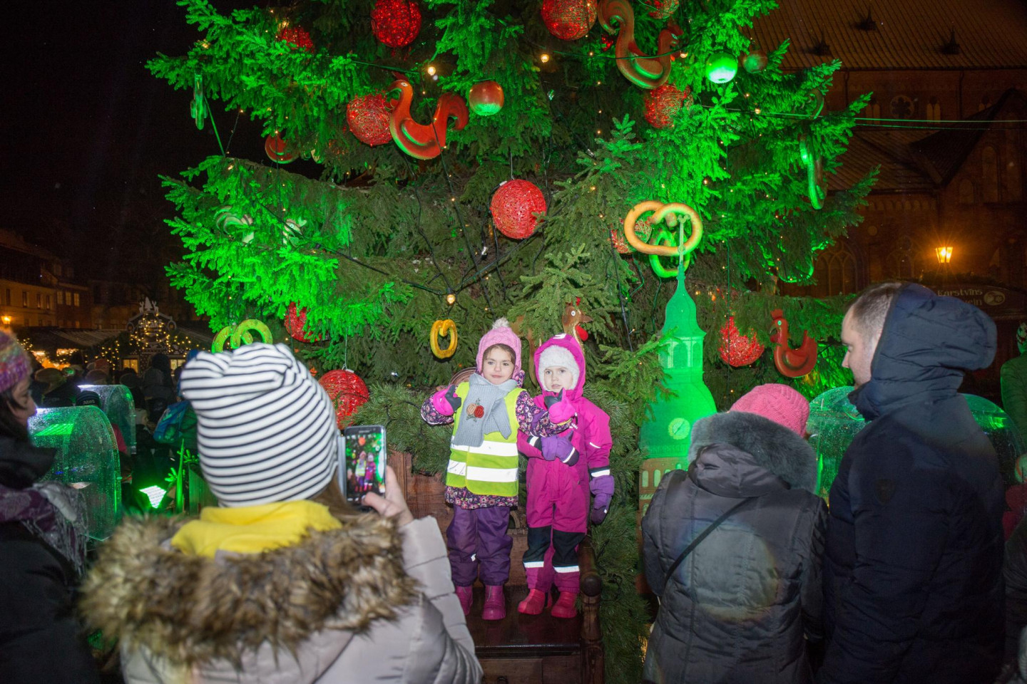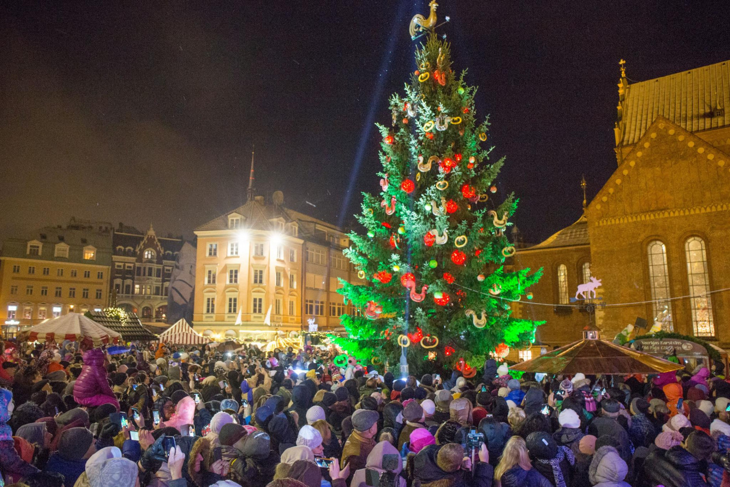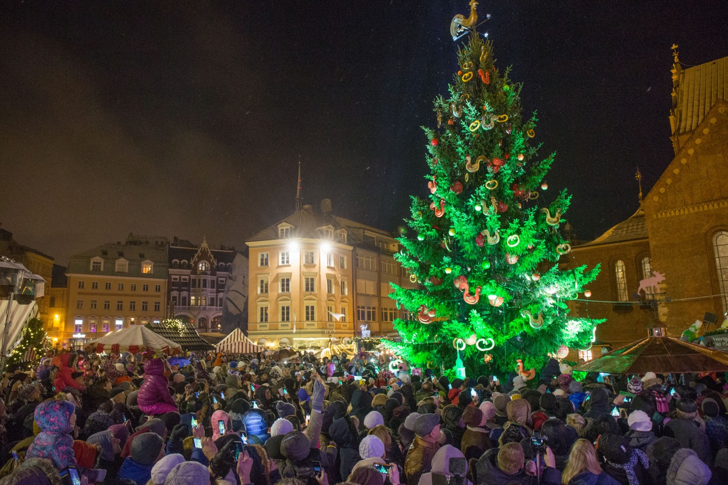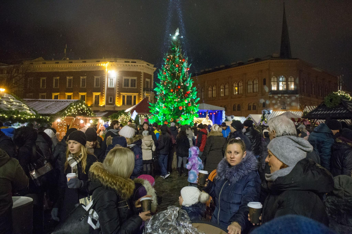 Spītējot brāzmainajam vējam un slapjajam sniegam, simtiem cilvēku šodien ieradās uz Ziemassvētku egles iedegšanas pasākumu Rīgā, Doma laukumā