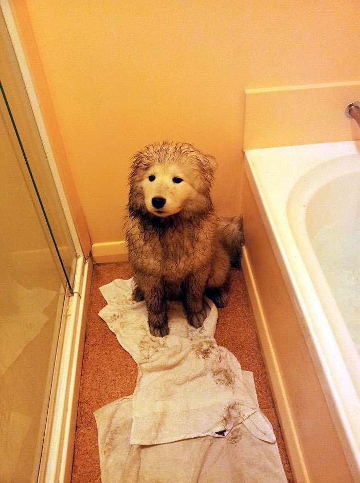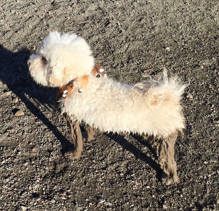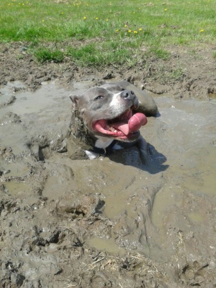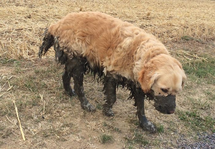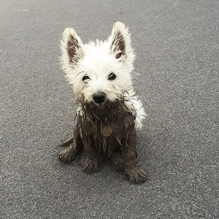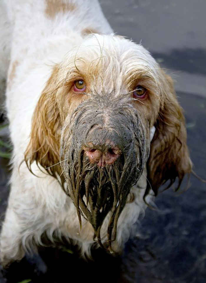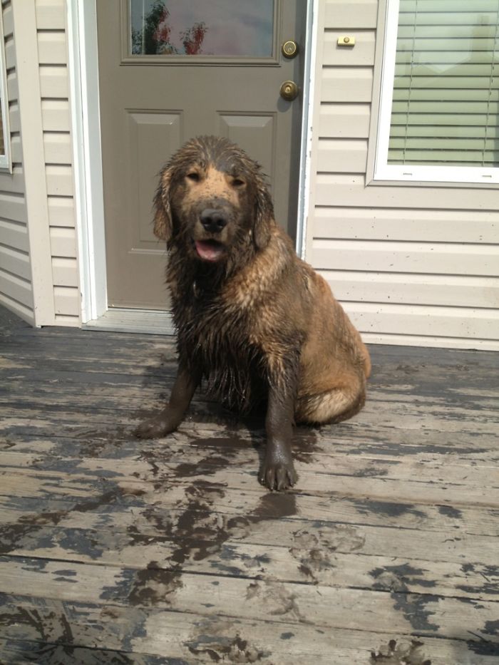 PASMAIDĀM: Suņi pēc peldes dubļu vannā