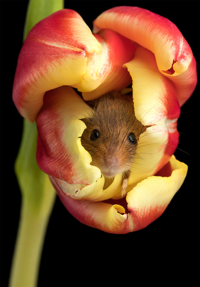 MĪLĪGI: Grauzējs iepozē fotogrāfam tulpēs