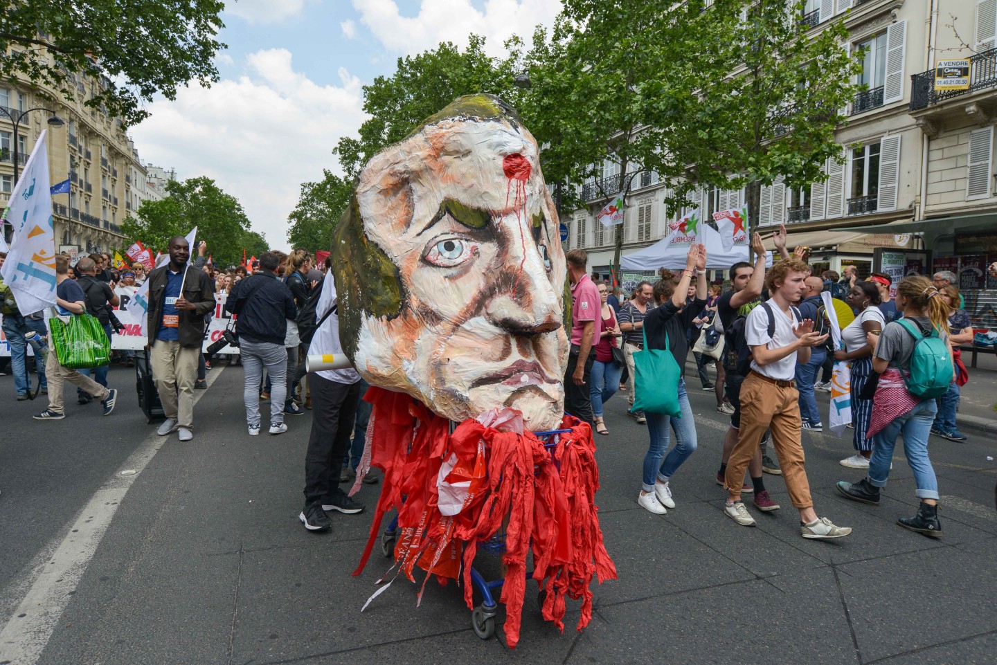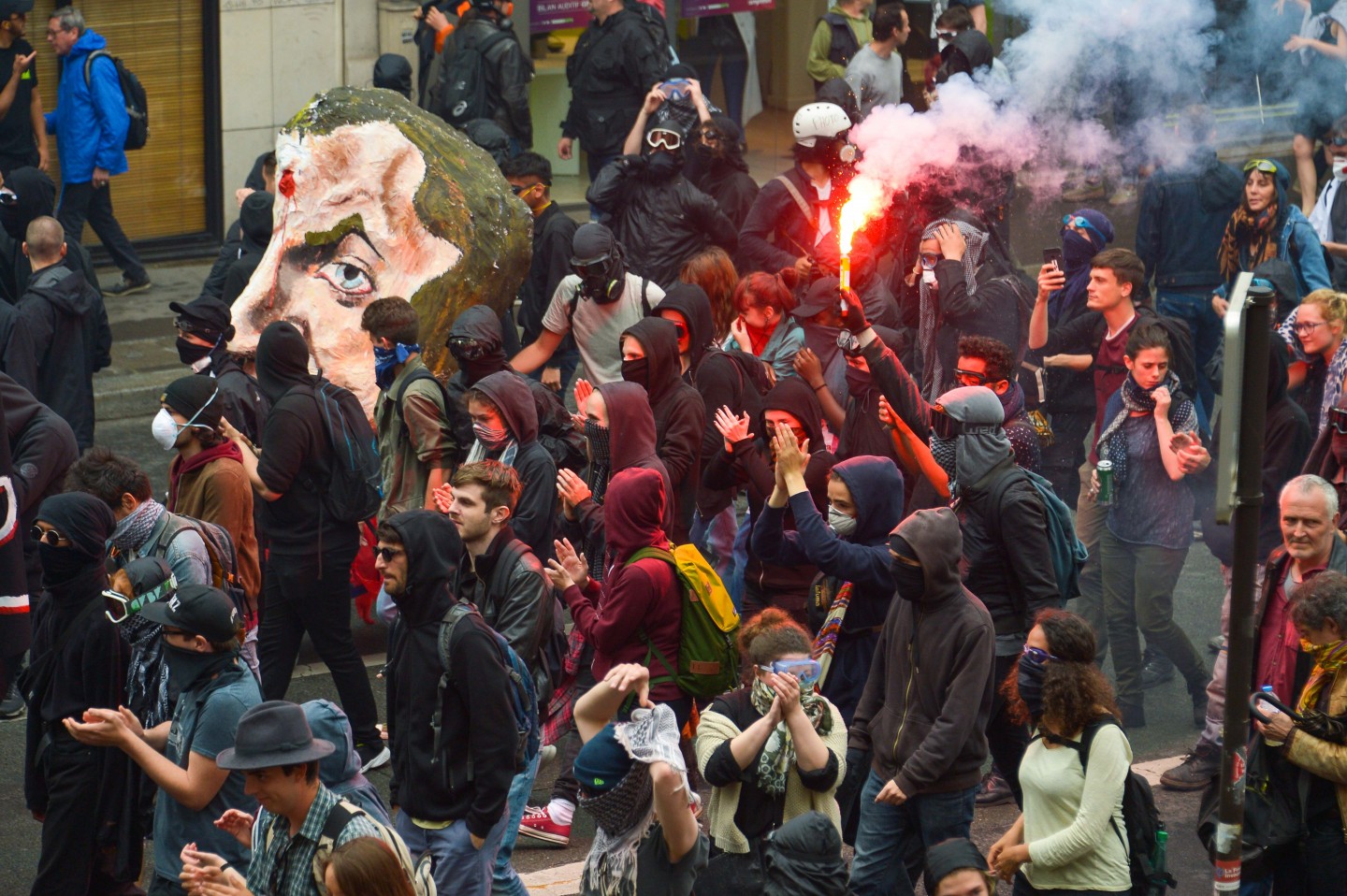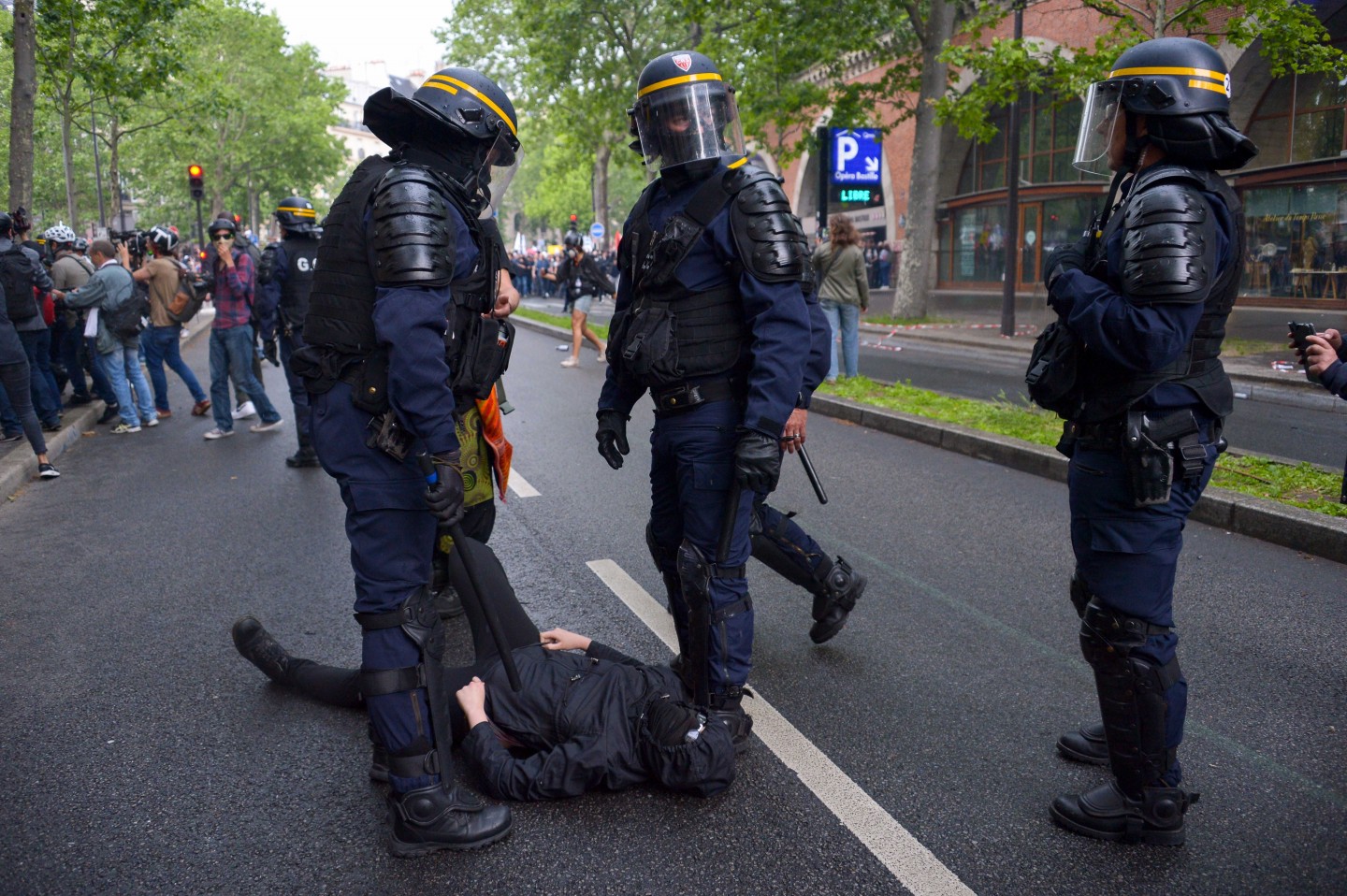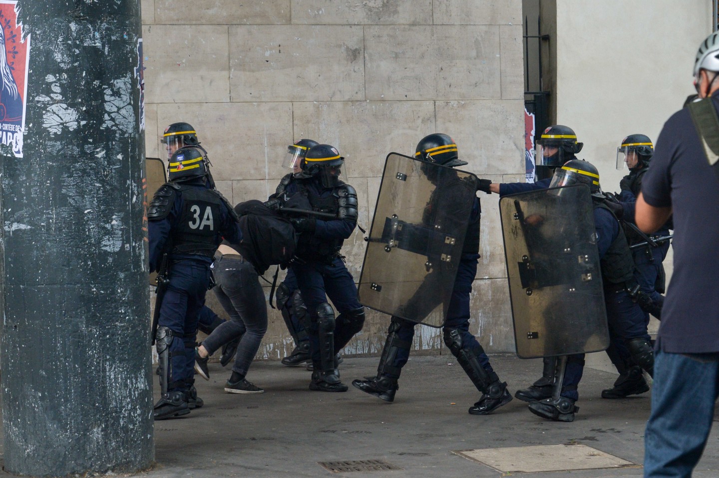 Parīzē otrdien notikušo protestu laikā izcēlās sadursmes starp maskējušos jauniešu grupām un policiju, kuru gaitā tika viegli ievainoti astoņi cilvēki, tai skaitā divi policisti, un policija aizturēja 20 cilvēkus. Sabiedriskā sektora darbinieku arodbiedrība pēcpusdienā rīkoja protesta gājienu, bet tā priekšgalā vietu ieņēma apmēram 200 jauniešu, no kuriem daudzi bija aizseguši sejas ar slēpotāju maskām. Daži no šiem jauniešiem izsita veikalu logus un apmētāja ar dažādiem priekšmetiem policistus, kuri lietoja asaru gāzi un stekus viņu izklīdināšanai. Arodbiedrības protesta dalībnieki bija spiesti apturēt gājienu, līdz nekārtības beidzās. Viņi sasniedza gājiena beigu punktu Nācijas laukumā Parīzes austrumos, kur daži demonstranti sadedzināja milzīgu papjēmašē lelli Francijas prezidenta Emanuela Makrona veidolā. Kad gājiens izklīda, vairāki desmiti cilvēku iegāja kādā vidusskolā, bet policija iejaucās, lai izbeigtu improvizēto ēkas ieņemšanu, un evakuēja cilvēkus no skolas telpām. Francijas sabiedriskajā sektorā strādājošie otrdien pievienojās streikojošajiem dzelzceļniekiem, lai protestētu pret prezidenta Emanuela Makrona ierosinātajām reformām. Sabiedriskā sektora reformas, kuras plānots īstenot nākamgad, paredz plašāku līgumdarbinieku izmantošanu un līdz 2022.gadam likvidēt 120 000 no pašreizējiem 5,6 miljoniem darbavietu. Daudzi civildienesta ierēdņi baidās pazaudēt savu īpašo statusu un šobrīd līdz mūža beigām garantētās darbavietas, kā tas šobrīd jau notiek ar tiem, kurus no jauna pieņem darbā valsts dzelzceļa uzņēmumā SNCF. Šis sabiedriskā sektora streiks ir jau trešais kopš Makrona nākšanas pie varas 2017.gadā.