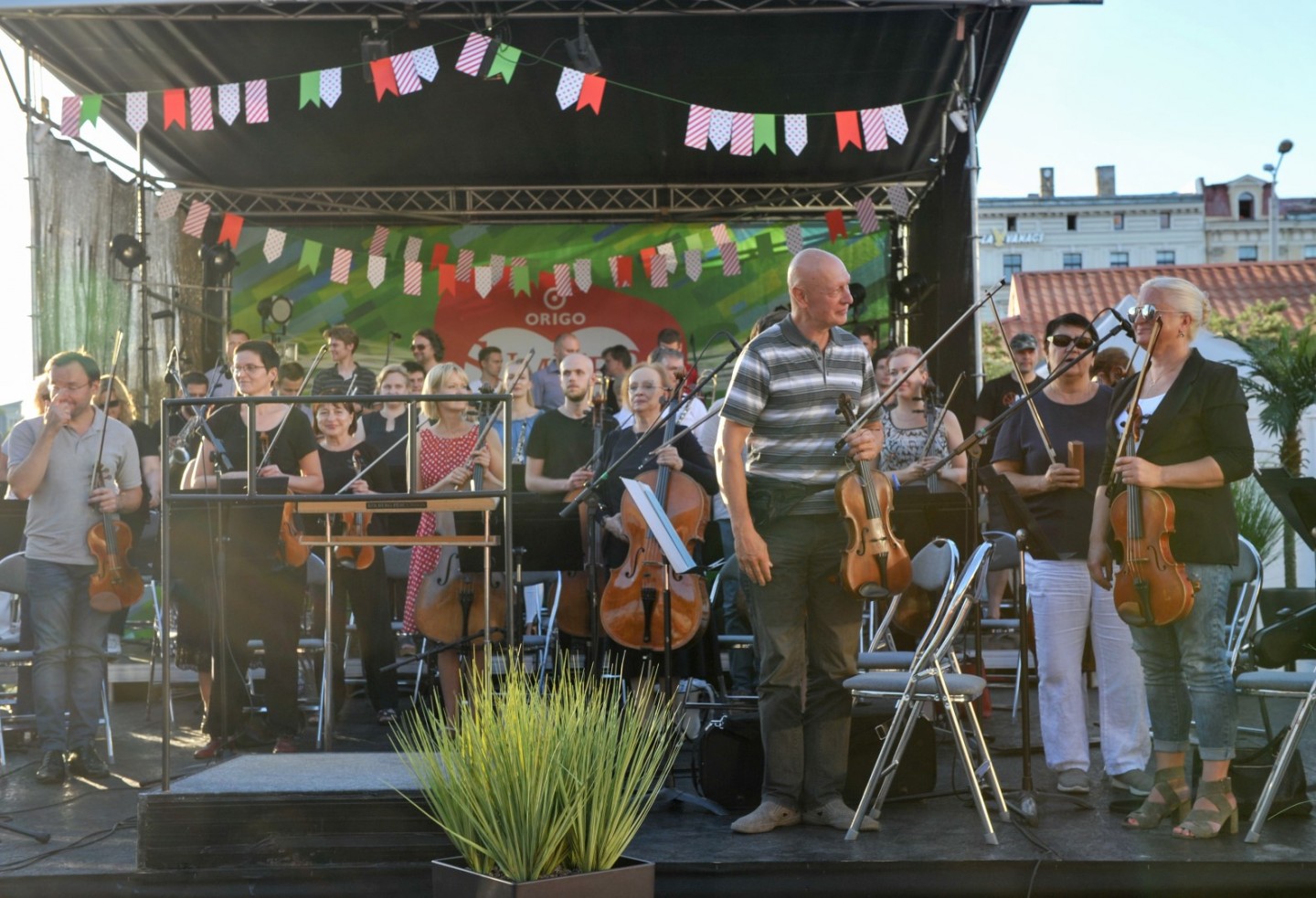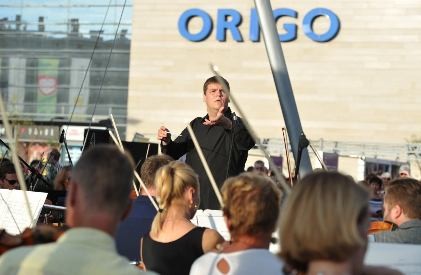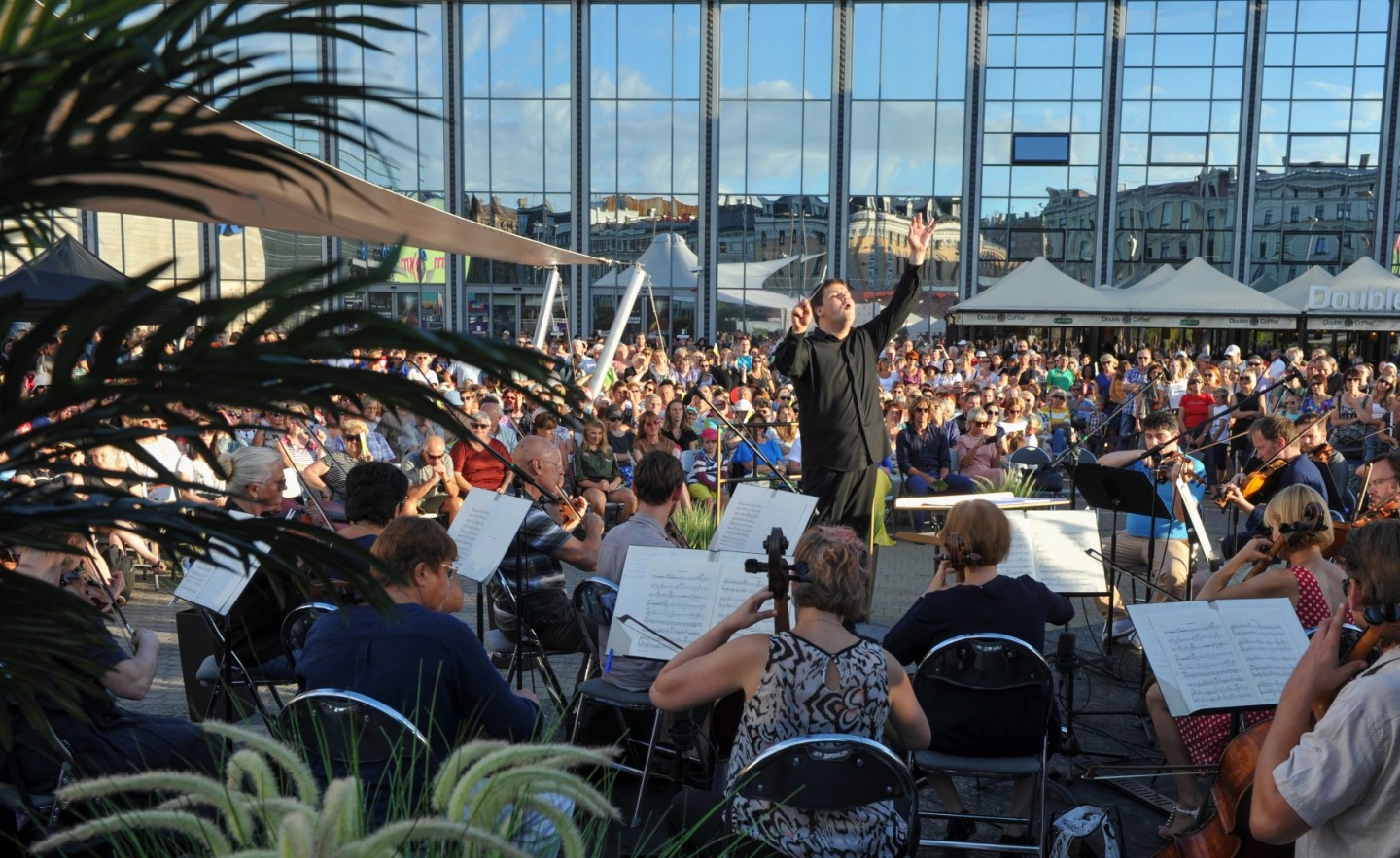 Vakar, 7. augustā jau otro gadu pēc kārtas norisinājās Latvijas Nacionālā simfoniskā orķestra (LNSO) koncerts "Origo" laukumā. Koncertā pašā Rīgas centrā piedalījās 77 mūziķi, spēlējot zem klajas debess un pulcējot vairākus simtus klausītāju. Bija baudāmi gan skaņdarbi ansambļa "LNSO Brass" izpildījumā, gan LNSO atskaņota mūzika, ko diriģēja LNSO mākslinieciskais vadītājs un galvenais diriģents Andris Poga. Pasākumu ar klātbūtni pagodināja Latvijas Republikas kultūras ministre Dace Melbārde. Koncerts norisinājās divās daļās bez starpbrīža. "LNSO Brass" ansamblis jeb metālpūšaminstrumentu ansamblis izpildīja septiņus skaņdarbus – G. F. Hendel "Overture from Water Music", Jean-Joseph Mouret "Fanfare Rondeau", Marģera Zariņa fokstrots no kino filmas "Pie bagātās kundzes", V. Monti "Čardašs", Jerome Kern "They didn't believe me", Vaughn Horton un Denver Darling "Choo Choo ch'boogie", Wayne Shanklin "Chanson D'Amour". Savukārt Latvijas Nacionālais simfoniskais orķestris pilnā sastāvā izpildīja Leonarda Bernsteina svītu no mūzikla "Vestsaidas stāsts" ("West Side Story"). Skaņdarbs "Simfoniskās dejas" no mūzikla "Vestsaidas stāsts" tika izpildīts, gatavojoties Leonarda Bernsteina 100. gadu jubilejai šī gada 25. augustā. Šis skaņdarbs ir mūzikla populārāko melodiju liesmains, kontrastains, aizraujošs apkopojums – skatuves darba simfoniska kvintesence. LNSO mākslinieciskais vadītājs un galvenais diriģents Andris Poga saka: "Tas ir absolūts tīrradnis, pat sava veida zīmols amerikāņu mūziklu klāstā. Tā ir mūzika, kas nenoveco, un man šķiet, ka tā vienlīdz spēcīgi uzrunā un aizrauj visu paaudžu klausītājus arī 21. gadsimtā."