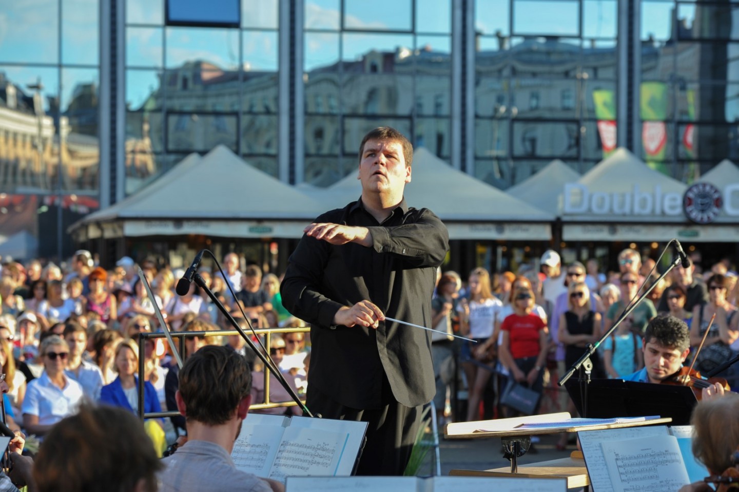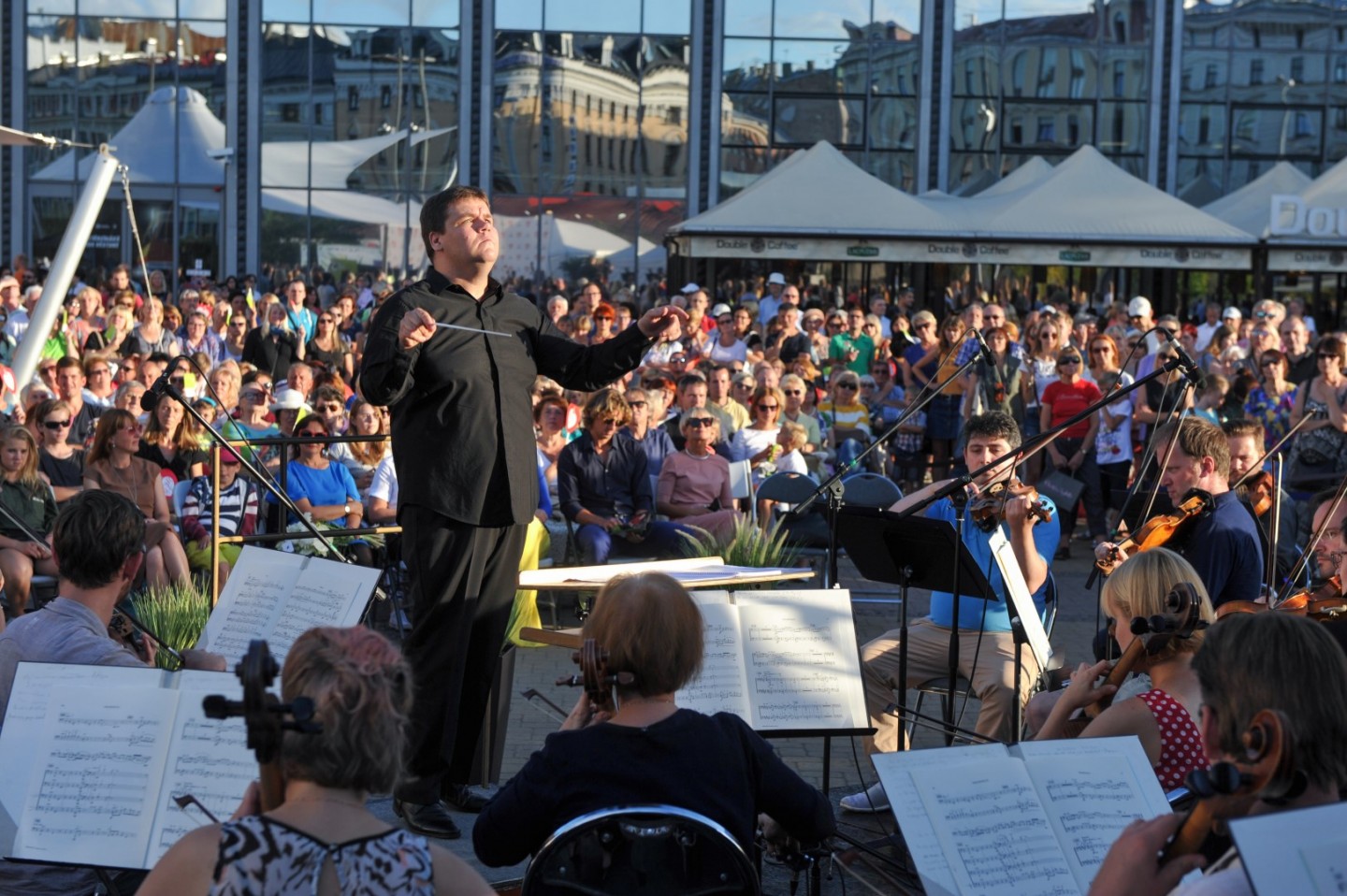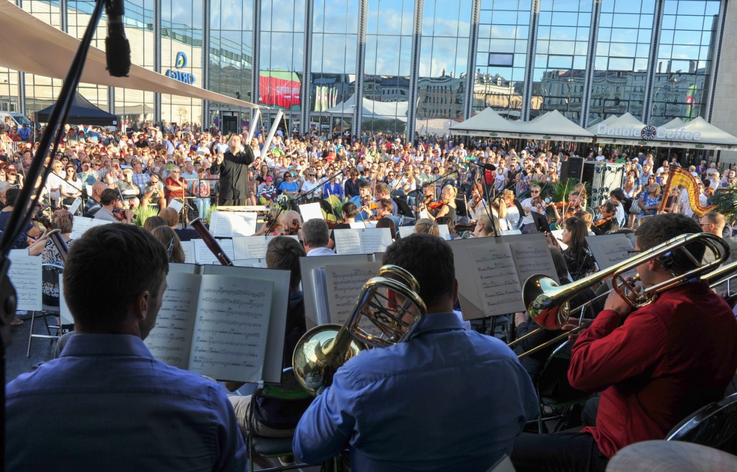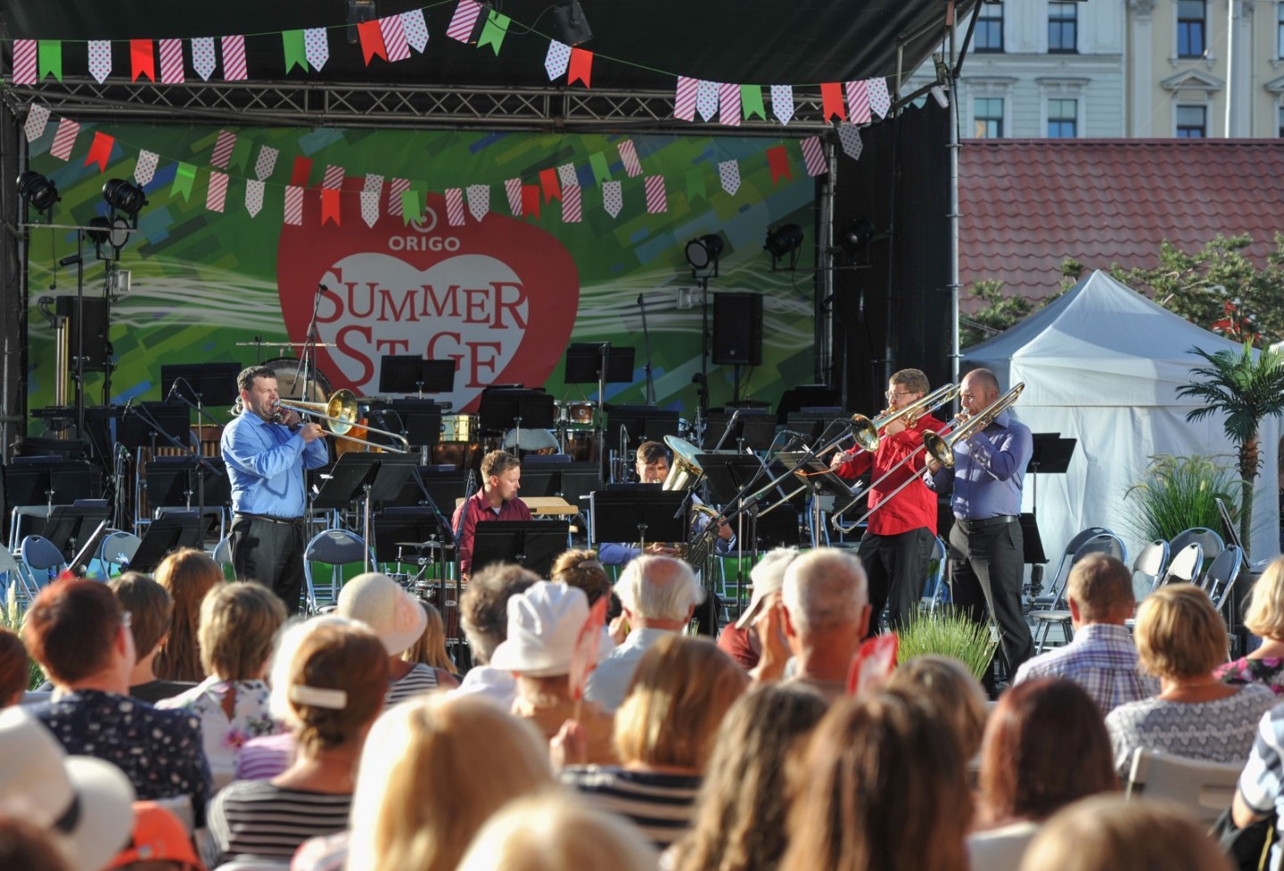Vakar, 7. augustā jau otro gadu pēc kārtas norisinājās Latvijas Nacionālā simfoniskā orķestra (LNSO) koncerts "Origo" laukumā. Koncertā pašā Rīgas centrā piedalījās 77 mūziķi, spēlējot zem klajas debess un pulcējot vairākus simtus klausītāju. Bija baudāmi gan skaņdarbi ansambļa "LNSO Brass" izpildījumā, gan LNSO atskaņota mūzika, ko diriģēja LNSO mākslinieciskais vadītājs un galvenais diriģents Andris Poga. Pasākumu ar klātbūtni pagodināja Latvijas Republikas kultūras ministre Dace Melbārde. Koncerts norisinājās divās daļās bez starpbrīža. "LNSO Brass" ansamblis jeb metālpūšaminstrumentu ansamblis izpildīja septiņus skaņdarbus – G. F. Hendel "Overture from Water Music", Jean-Joseph Mouret "Fanfare Rondeau", Marģera Zariņa fokstrots no kino filmas "Pie bagātās kundzes", V. Monti "Čardašs", Jerome Kern "They didn't believe me", Vaughn Horton un Denver Darling "Choo Choo ch'boogie", Wayne Shanklin "Chanson D'Amour". Savukārt Latvijas Nacionālais simfoniskais orķestris pilnā sastāvā izpildīja Leonarda Bernsteina svītu no mūzikla "Vestsaidas stāsts" ("West Side Story"). Skaņdarbs "Simfoniskās dejas" no mūzikla "Vestsaidas stāsts" tika izpildīts, gatavojoties Leonarda Bernsteina 100. gadu jubilejai šī gada 25. augustā. Šis skaņdarbs ir mūzikla populārāko melodiju liesmains, kontrastains, aizraujošs apkopojums – skatuves darba simfoniska kvintesence. LNSO mākslinieciskais vadītājs un galvenais diriģents Andris Poga saka: "Tas ir absolūts tīrradnis, pat sava veida zīmols amerikāņu mūziklu klāstā. Tā ir mūzika, kas nenoveco, un man šķiet, ka tā vienlīdz spēcīgi uzrunā un aizrauj visu paaudžu klausītājus arī 21. gadsimtā."