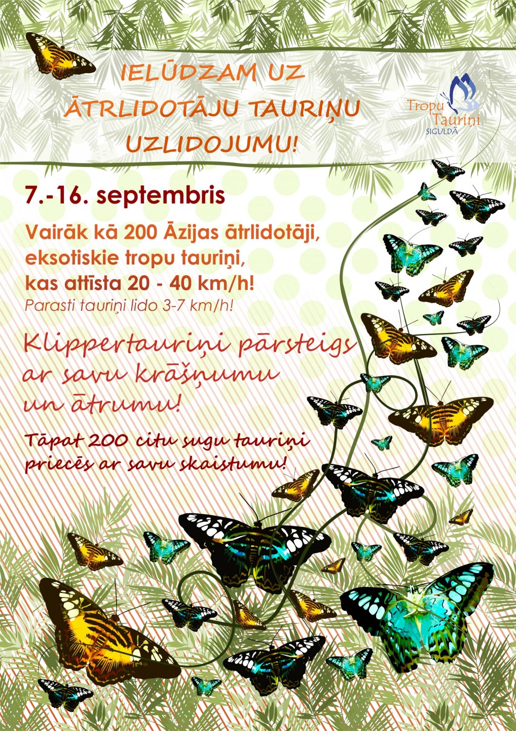 Siguldas tropu tauriņu mājā ielūdz uz Ātro lidotāju tauriņu uzlidojumu! No 7. līdz 16. septembrim vairāk kā 200 Āzijas ātrlidotāju - Klippertauriņi, kas attīsta 20-40 km/h – būs vērojami Siguldas tauriņu mājā. Ātrlidotāju uzlidojumā varēsiet baudīt tauriņu spārnu krāšņumu un izjust īstu tropu sajūtu, ko radīs skaisti tropu augi, ziedi, zivis, bruņurupuči, tropu putni, kā arī 200 dažādu tropu eksotisko tauriņu. Siguldas tauriņu mājā kopā varēsi iepazīt vairāk nekā 15 dažādas sugas! Klippertauriņš (Parthenos sylvia) ir raibeņu tauriņš, kurš dabā ir atrodams Dienvidamerikā un Dienvidaustrumāzijā. Dzīvo galvenokārt dažādās mežu platībās un upju ielejās. Tiek uzskatīts, ka šis tauriņš lidojot peld, jo tā spārni lidojot kustās tikai dažu grādu leņķī. Kilppertauriņi ir divās krāsās: tīģeroranžā un zilā. Spārnu krāsojums variē vairākās nokrāsas. Tieši šis tauriņš daudzus pārsteidz ar savu ilgstošo lidojumu, jo nemēdz bieži apstāties. Tie spēj sasniegt lidošanas ātrumu 20 km/h, un ir fiksēti atsevišķi gadījumi, kad lidojuma ātrums sasniedz pat 40 km/h. Tauriņi galvenokārt pārtiek no ziedu nektāra un dažādu augļu sulas. Iecienītākie ziedi ir lantanas ziedi, iecienītākais auglis - apelsīns un ābols. Pieauguša tauriņa dzīves ilgums ir līdz pat 30 dienām. Siguldas tropu tauriņu mājā sastapsiet arī 200 citus eksotiskos tropu tauriņus! Zilais morfīds, kas atceļojis no tālās Dienvidamerikas, ir apmeklētāju nepārspēts favorīts. Pūčtauriņš - viens no izteiksmīgākajiem naktstauriņiem - pārsteigs ar savu izskatu! Atlasa gigantiskais tauriņš spārnu izmērā ir 20 līdz 34 cm liels! Koku nimfa, kas ir interesanta ar savu lidošanas manieri, to bieži sauc arī par papīra pūķi, būs izšķīlusies no zelta krāsas kūniņas! Par tauriņiem labvēlīgajiem apstākļiem liecina fakts, ka Siguldā tie var pilnvērtīgi aizvadīt visu dzīvesciklu, to iespējams apskatīt arī apmeklētājiem. Dabas draugiem Siguldas tauriņu mājā būs iespēja iepazīt ne tikai tauriņus un citus tropu mājas iemītniekus, bet arī redzēt dažādas tauriņu attīstības stadijas - oliņas, kāpurus un dažādu tauriņu kūniņas. Lai tauriņu dažādība un skaits tropu mājā būtu ievērojams, katru nedēļu tiek pasūtītas aptuveni 100-200 jaunas kūniņas no tauriņu audzētavām dažādās tropu zemēs. Gaidīsim aizrautīgos dabas draugus Siguldā!
