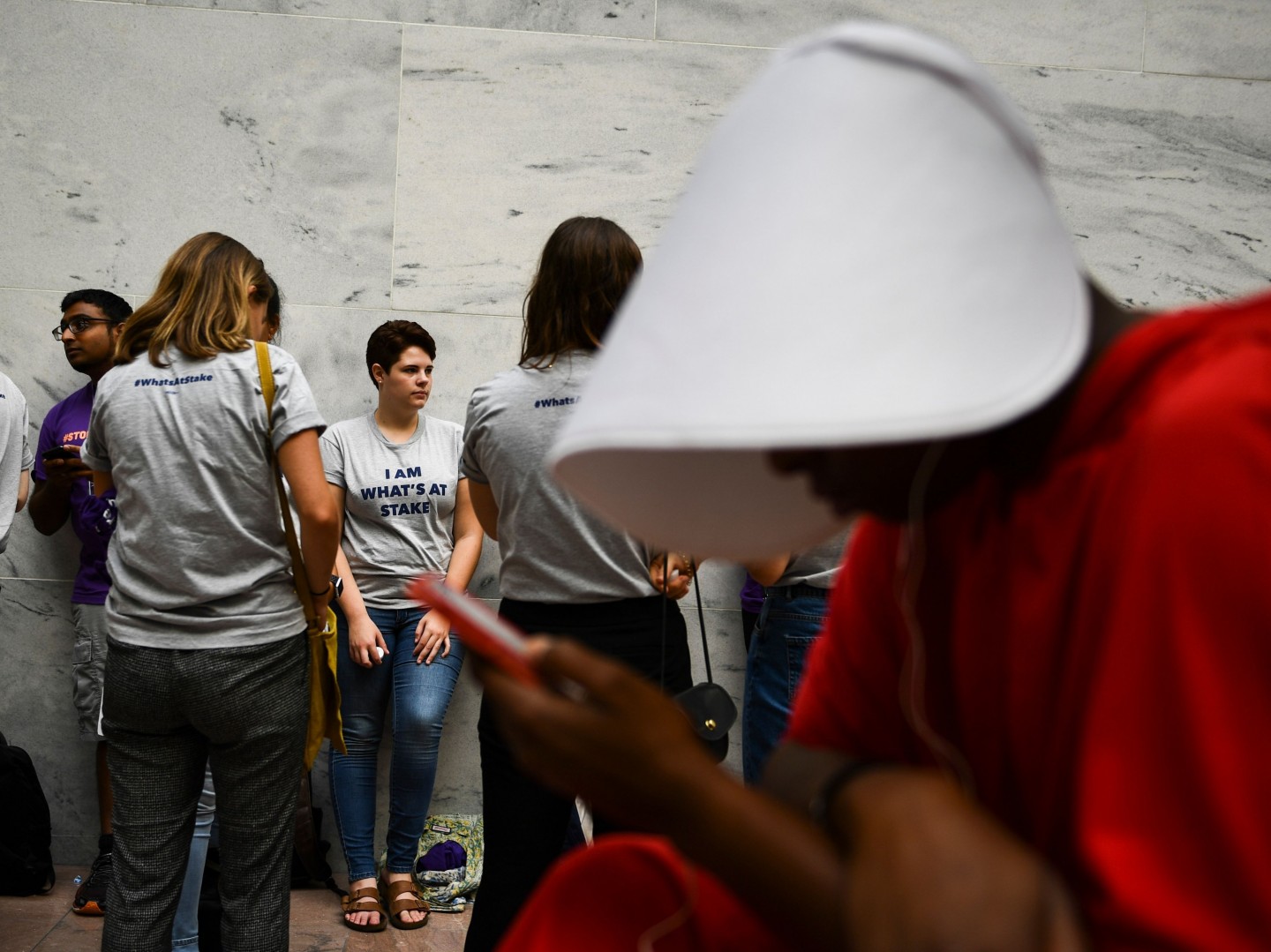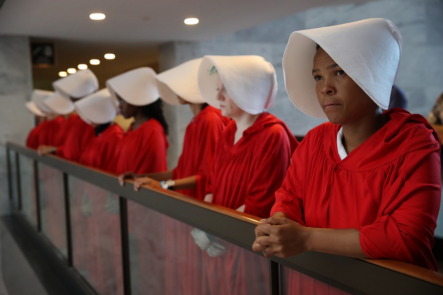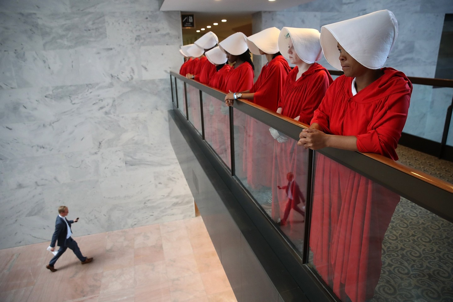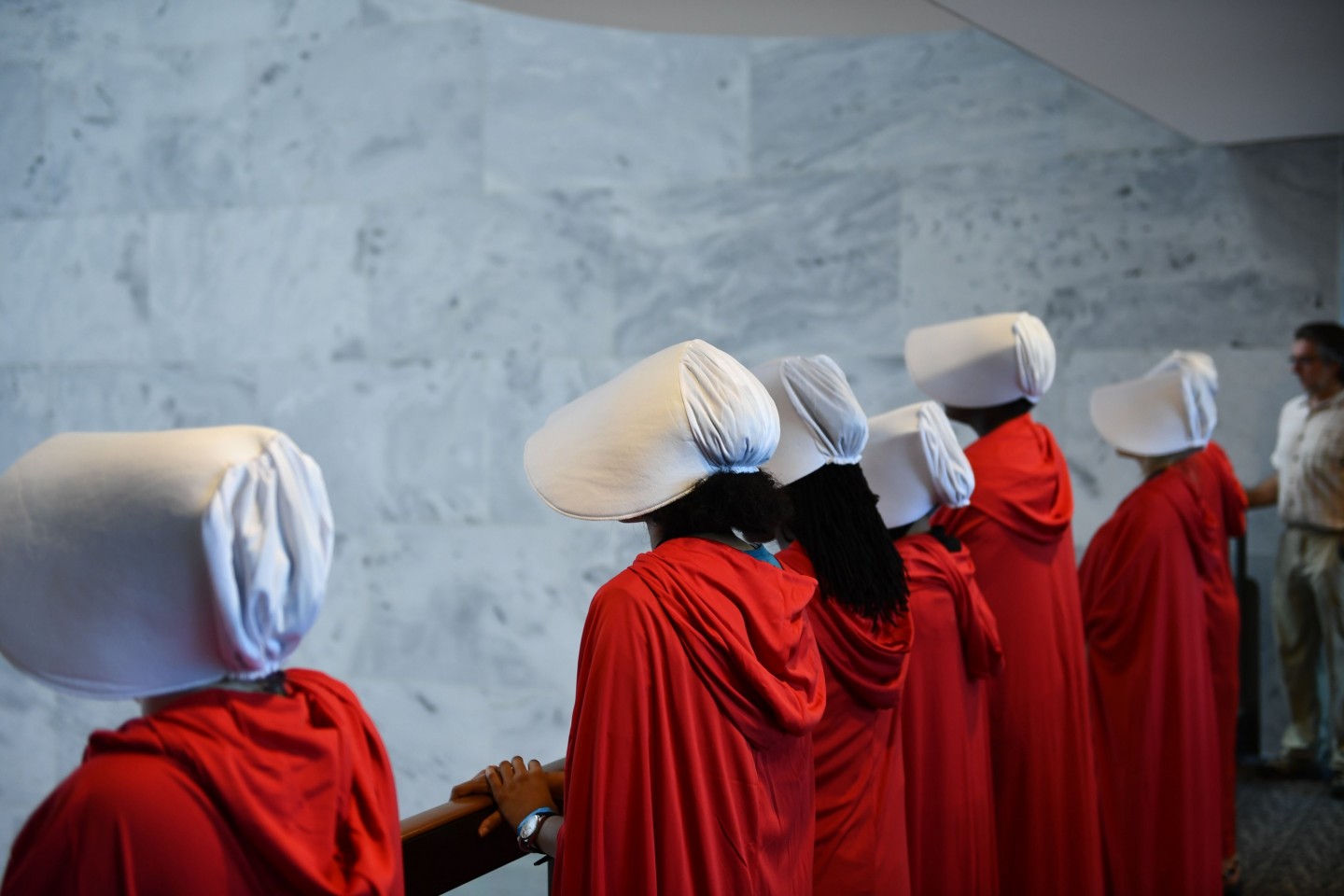 Sievietes, ģērbušās kā seriāla "Kalpones stāsts" varones, ASV protestēja par jaunāko ASV Augstākās tiesas tiesneša nominantu Bretu Kavanu, kurš iestājas pret abortiem un pārstāv sievietēm nelabvēlīgus uzskatus.