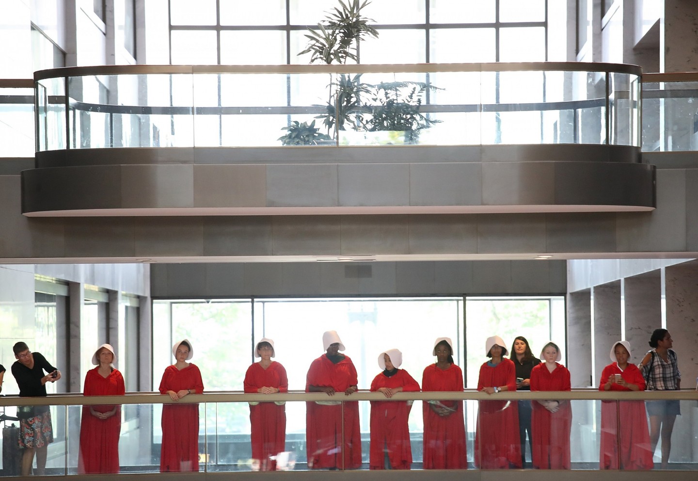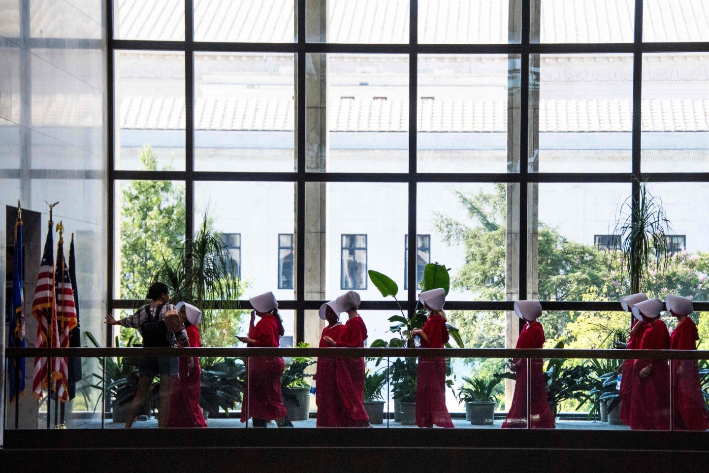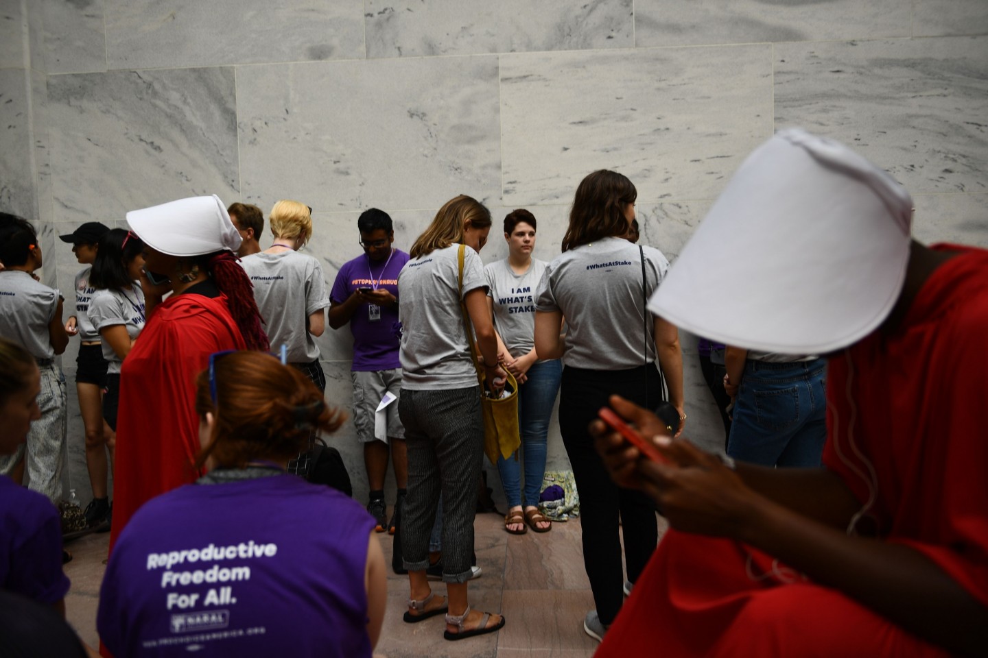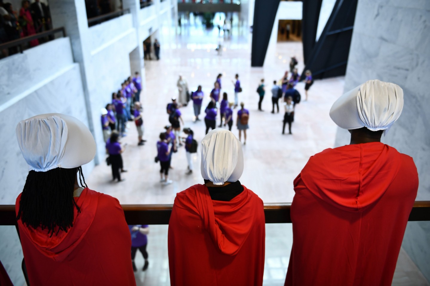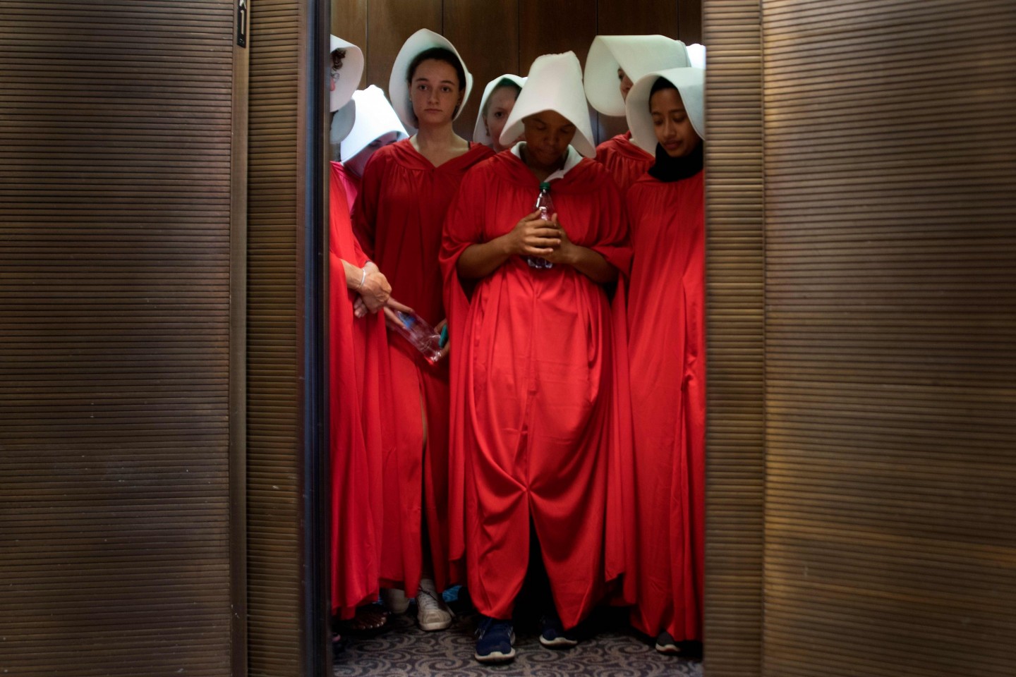 Sievietes, ģērbušās kā seriāla "Kalpones stāsts" varones, ASV protestēja par jaunāko ASV Augstākās tiesas tiesneša nominantu Bretu Kavanu, kurš iestājas pret abortiem un pārstāv sievietēm nelabvēlīgus uzskatus.