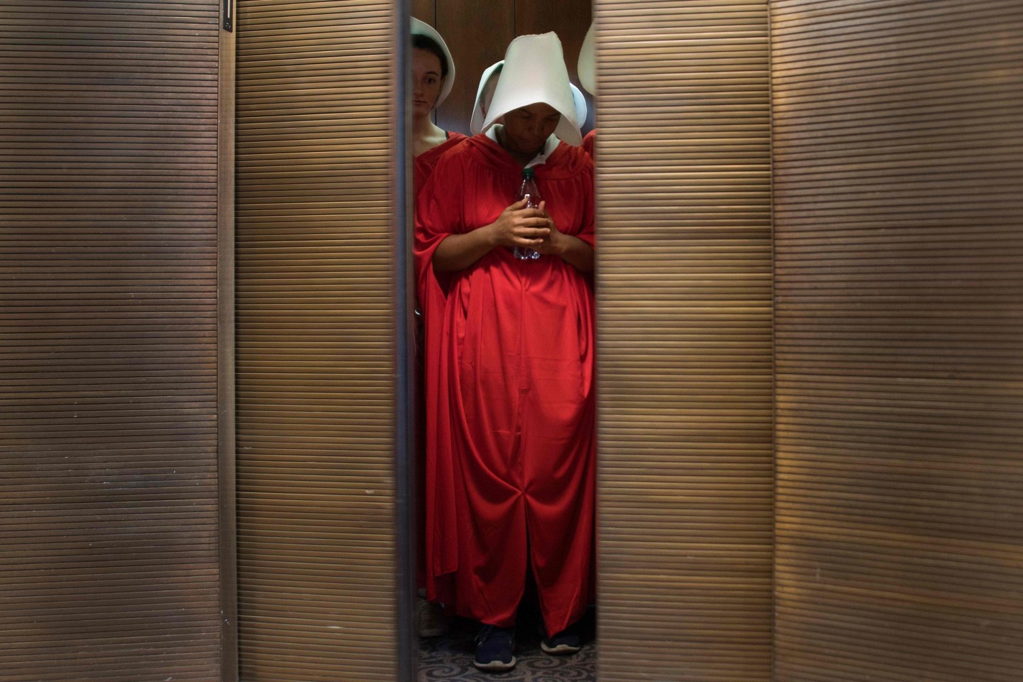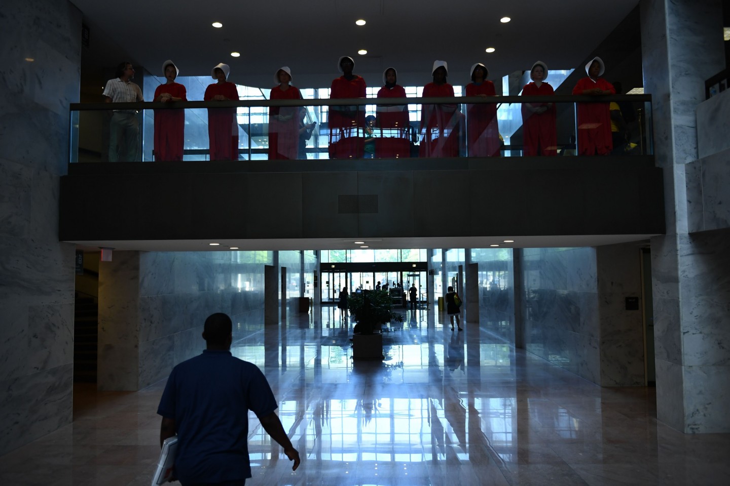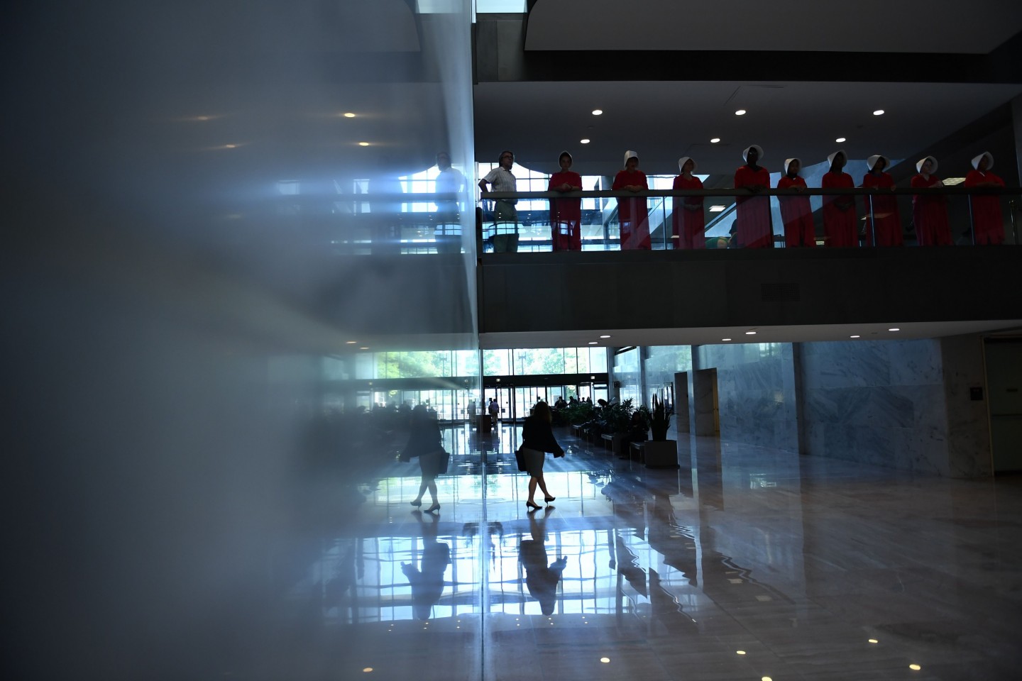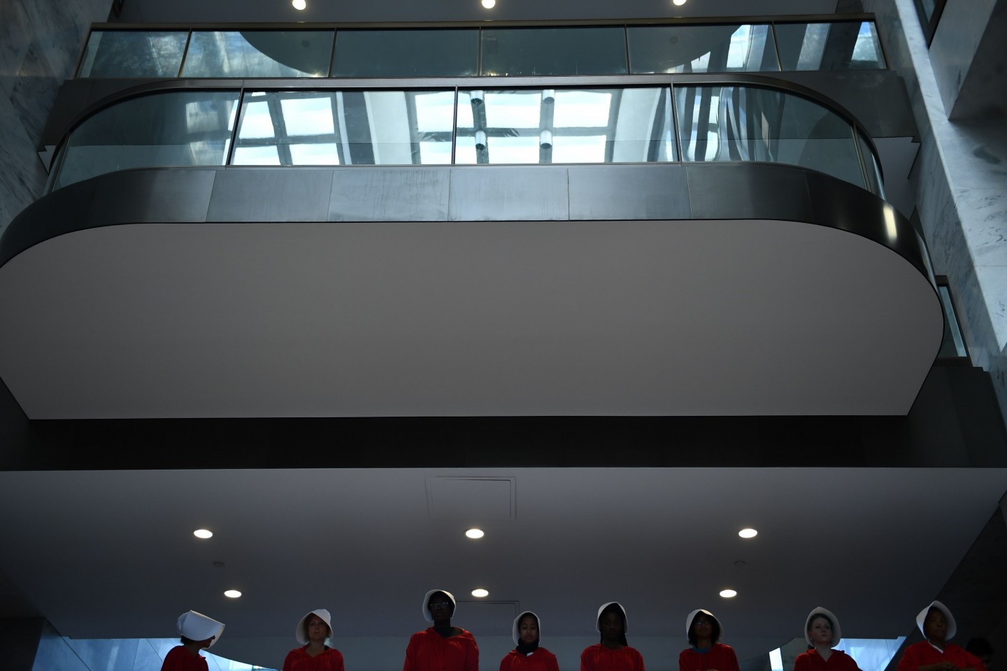 Sievietes, ģērbušās kā seriāla "Kalpones stāsts" varones, ASV protestēja par jaunāko ASV Augstākās tiesas tiesneša nominantu Bretu Kavanu, kurš iestājas pret abortiem un pārstāv sievietēm nelabvēlīgus uzskatus.