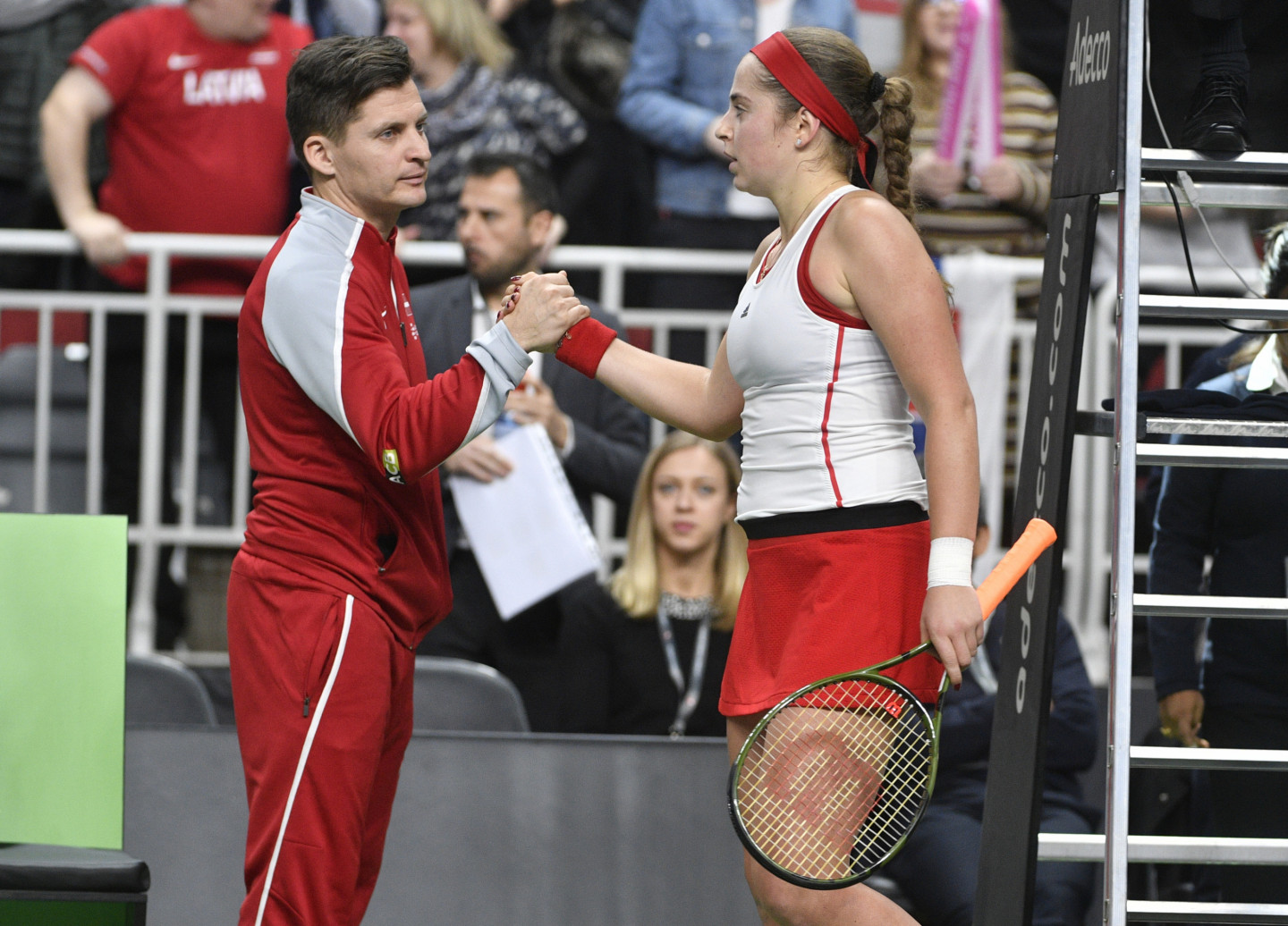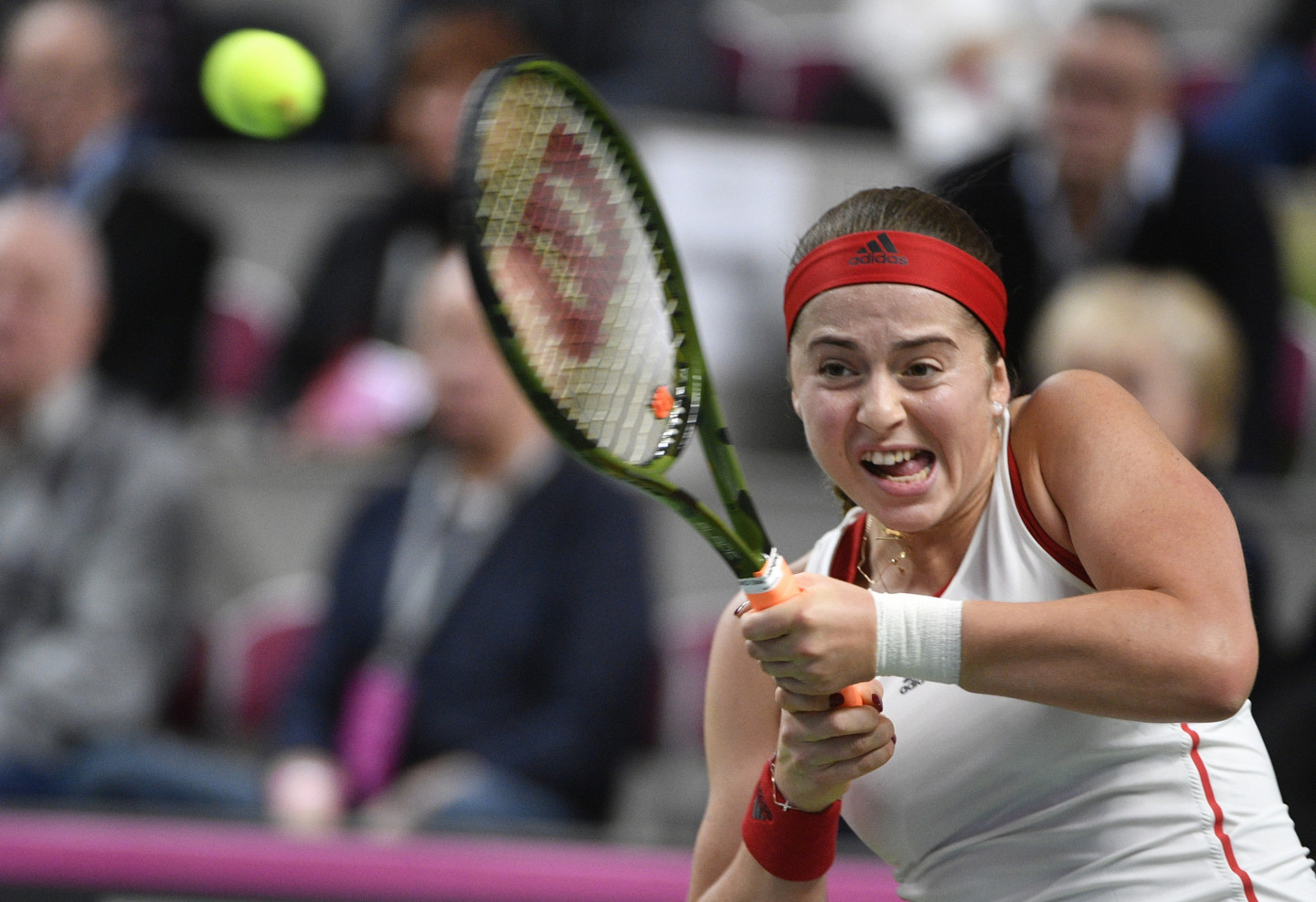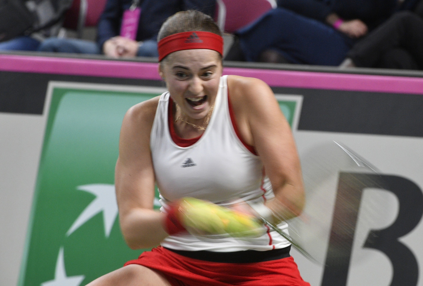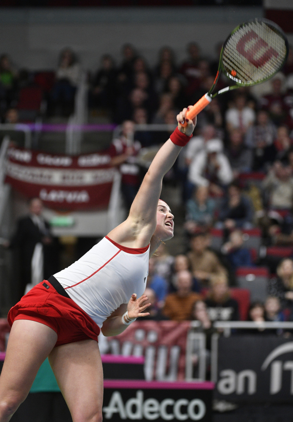 Latvijas sieviešu tenisa otrā rakete Aļona Ostapenko Federāciju kausa Pasaules otrās grupas pirmās kārtas duelī šodien aizvadīja cīņu pret slovākieti Rebeku Šramkovu.