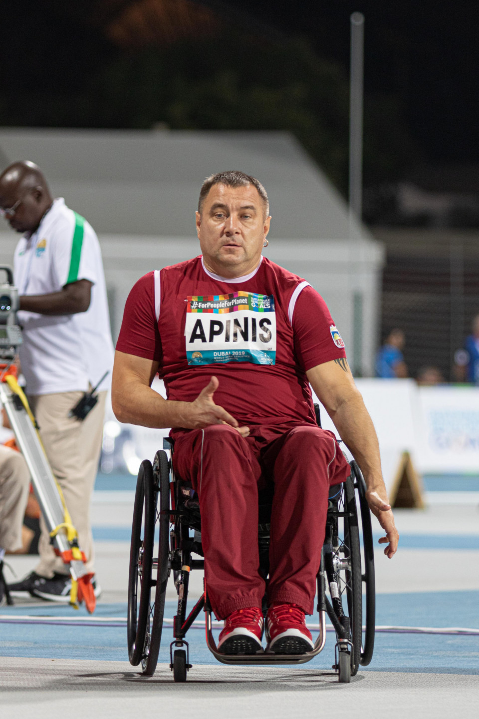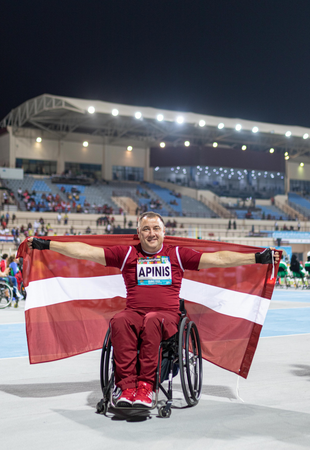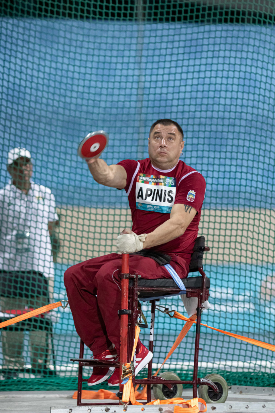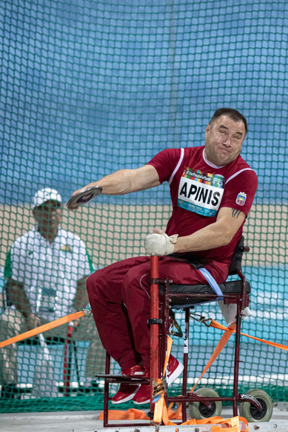 Latvijas paralimpietis Aigars Apinis Pasaules čempionātā paravieglatlētikā Dubaijā izcīnījis zelta medaļu diska mešanā. Deviņu fināla sportistu konkurencē viņš aizmetis disku vistālāk – 21,05 metrus. Šī ir jau astotā zelta medaļa diska mešanā, ko Aigars Apinis pasaules čempionātos un Paralimpiskajās spēlēs kopš 2000. gada izcīnījis Latvijai. "Šis bija viens no grūtākajiem pasaules čempionātiem garās sezonas dēļ – pirms sacensībām bija intensīvs un ilgstošs gatavošanās periods. Paralimpiešiem mešanas disciplīnās šādās garās sezonās sagatavošanos traucē arī laika apstākļi, jo Latvijā cilvēkiem ar invaliditāti nav piemērotas vietas treniņiem rudens un ziemas sezonā. Taču kopumā es jūtu ļoti lielu gandarījumu par padarīto un sasniegto rezultātu. Esmu patiesi priecīgs, ka varēsim apbalvošanā atkal dzirdēt Latvijas himnu," saka pasaules čempions Aigars Apinis. "Mēs, visa Latvija, varam patiesi lepoties ar Aigaru, viņa neatlaidību, darbaspējām un sasniegumiem. Viņš kārtējo reizi ir apstiprinājis savu čempiona titulu. Ceturtdien sacensībās un šodien apbalvošanas ceremonijā Latvijas vārdu dzirdēs vairāk nekā 1400 čempionāta dalībnieku un skatītāju, un vēl vairāki miljoni skatītāju pie TV ekrāniem, sociālajos tīklos un citos medijos," saka Latvijas Paralimpiskās komitejas prezidente Daiga Dadzīte. Apbalvošanas ceremonija Dubaijā notika šodien plkst. 15.15 (pēc Latvijas laika).