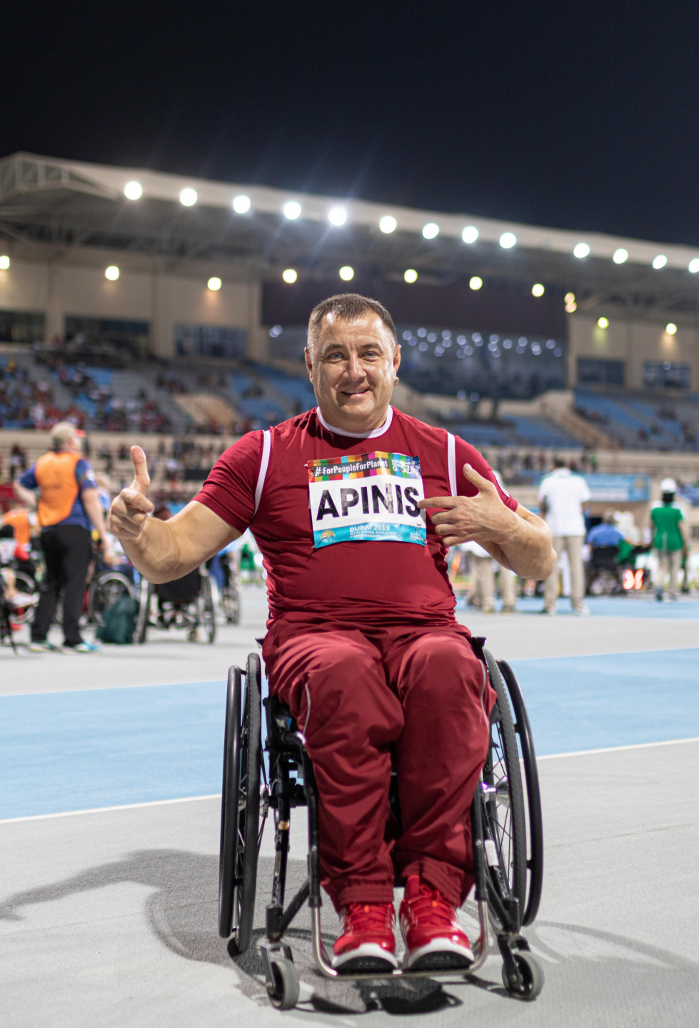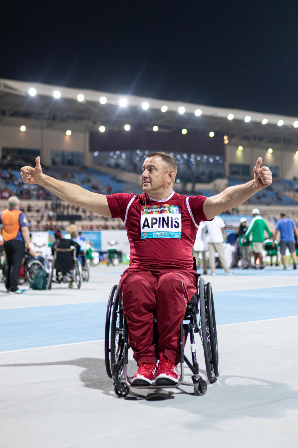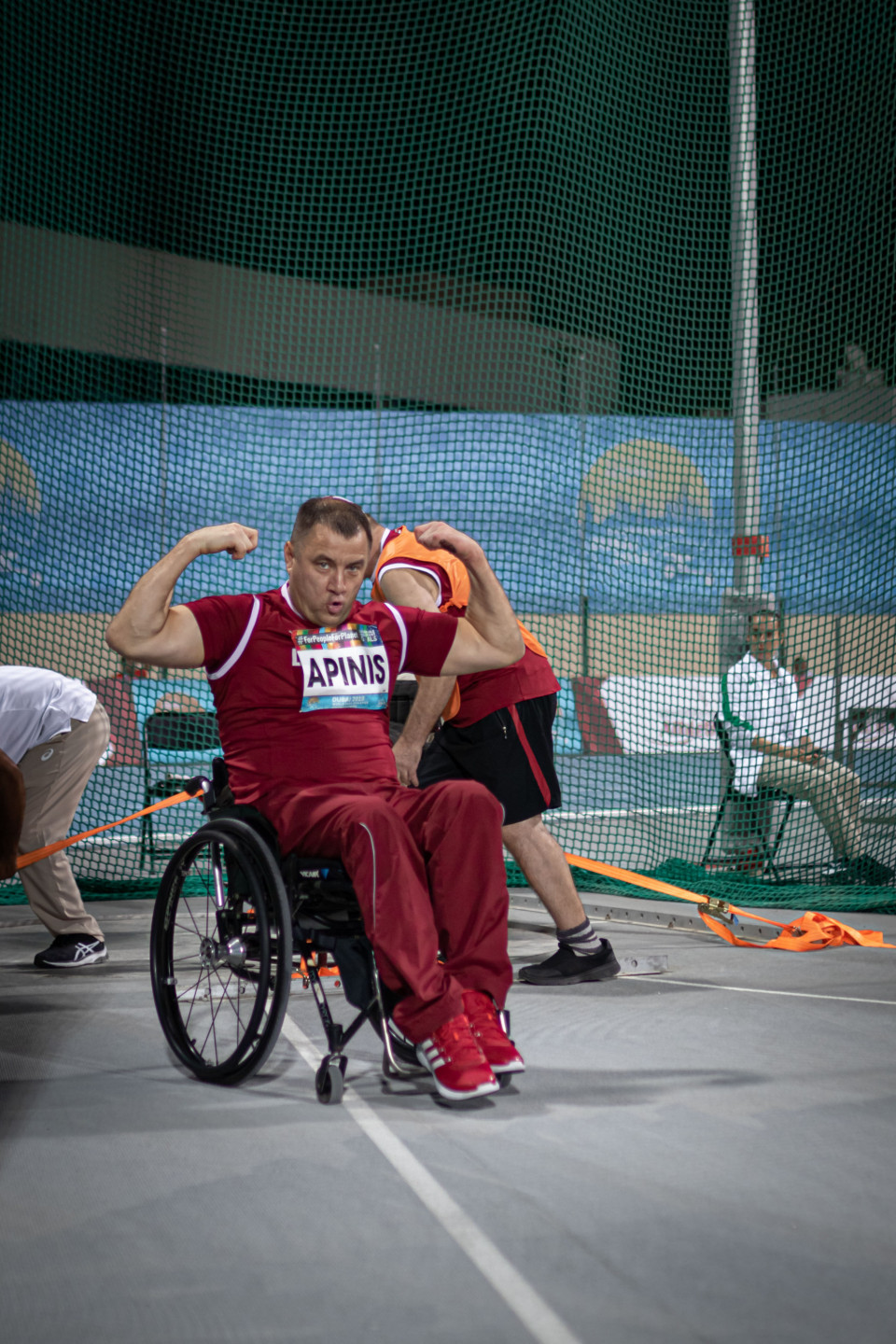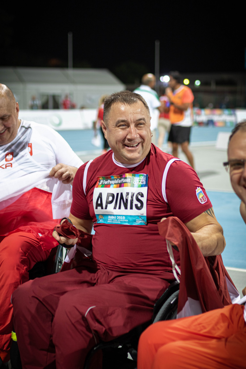 Latvijas paralimpietis Aigars Apinis Pasaules čempionātā paravieglatlētikā Dubaijā izcīnījis zelta medaļu diska mešanā. Deviņu fināla sportistu konkurencē viņš aizmetis disku vistālāk – 21,05 metrus. Šī ir jau astotā zelta medaļa diska mešanā, ko Aigars Apinis pasaules čempionātos un Paralimpiskajās spēlēs kopš 2000. gada izcīnījis Latvijai. "Šis bija viens no grūtākajiem pasaules čempionātiem garās sezonas dēļ – pirms sacensībām bija intensīvs un ilgstošs gatavošanās periods. Paralimpiešiem mešanas disciplīnās šādās garās sezonās sagatavošanos traucē arī laika apstākļi, jo Latvijā cilvēkiem ar invaliditāti nav piemērotas vietas treniņiem rudens un ziemas sezonā. Taču kopumā es jūtu ļoti lielu gandarījumu par padarīto un sasniegto rezultātu. Esmu patiesi priecīgs, ka varēsim apbalvošanā atkal dzirdēt Latvijas himnu," saka pasaules čempions Aigars Apinis. "Mēs, visa Latvija, varam patiesi lepoties ar Aigaru, viņa neatlaidību, darbaspējām un sasniegumiem. Viņš kārtējo reizi ir apstiprinājis savu čempiona titulu. Ceturtdien sacensībās un šodien apbalvošanas ceremonijā Latvijas vārdu dzirdēs vairāk nekā 1400 čempionāta dalībnieku un skatītāju, un vēl vairāki miljoni skatītāju pie TV ekrāniem, sociālajos tīklos un citos medijos," saka Latvijas Paralimpiskās komitejas prezidente Daiga Dadzīte. Apbalvošanas ceremonija Dubaijā notika šodien plkst. 15.15 (pēc Latvijas laika).