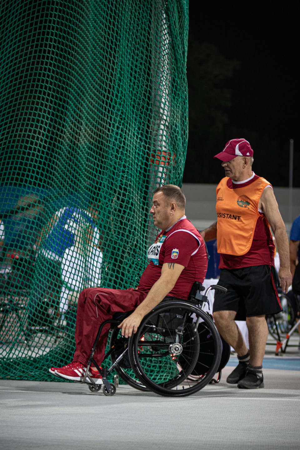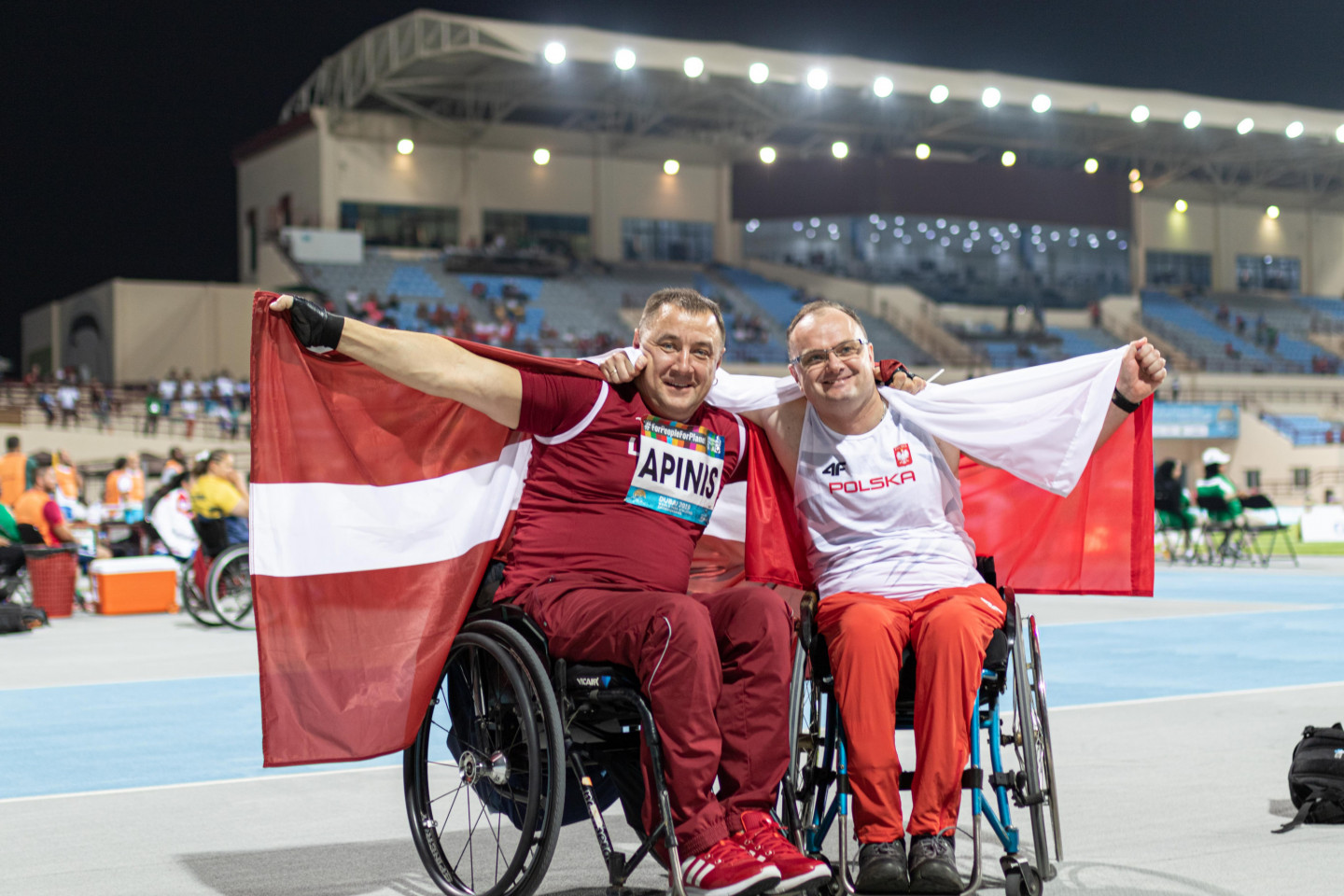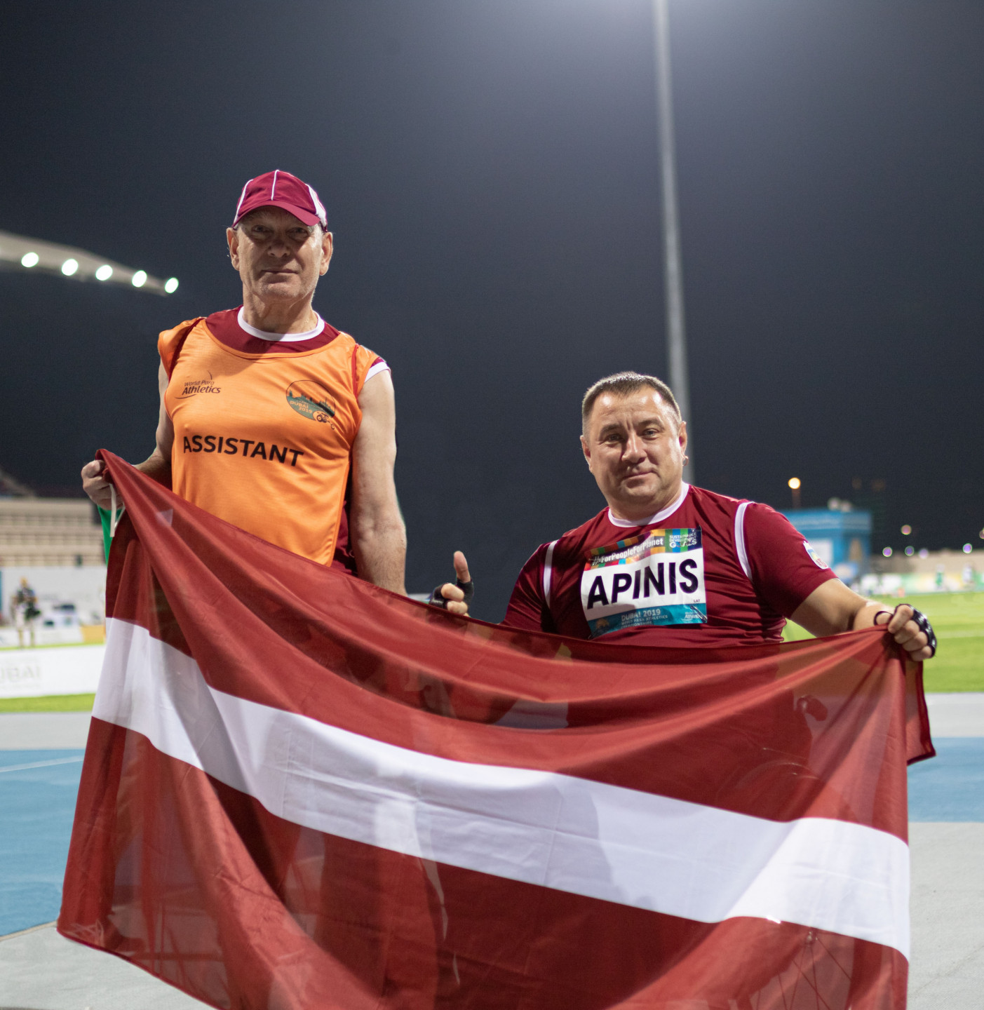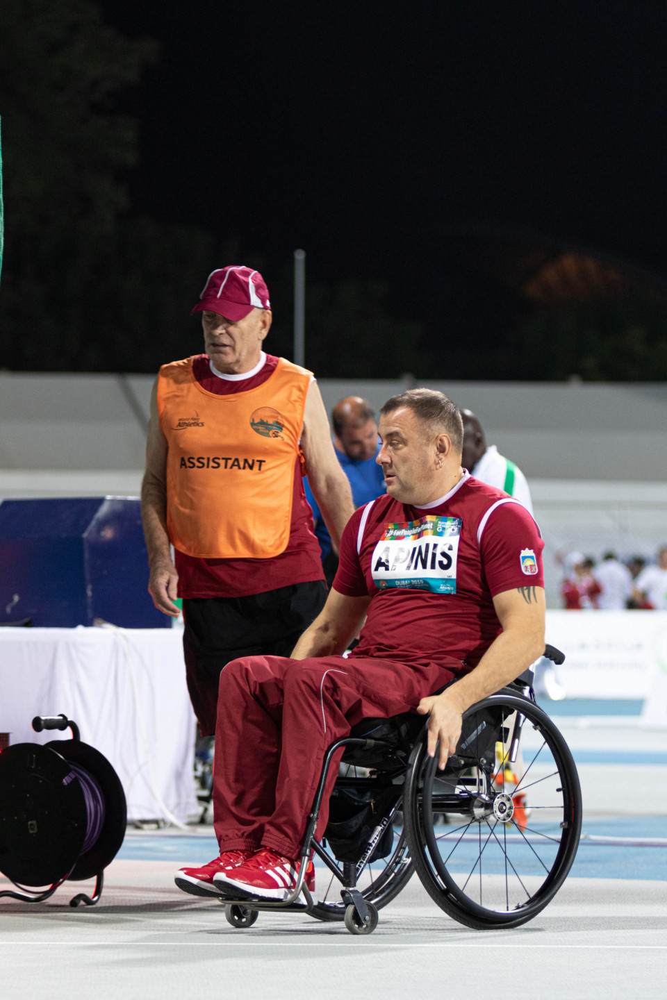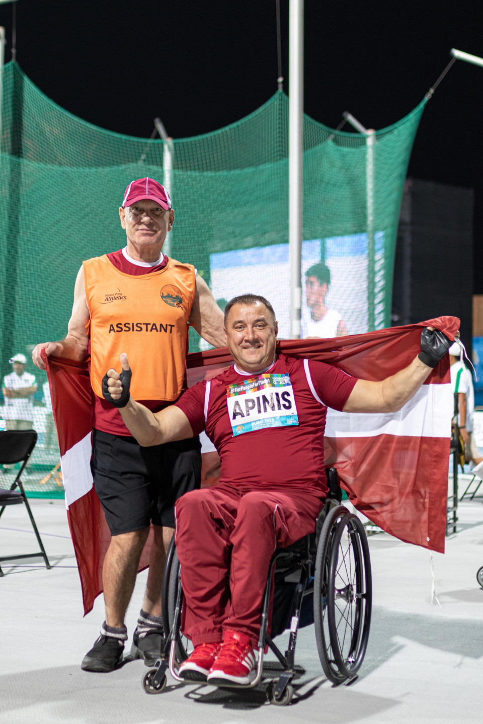 Latvijas paralimpietis Aigars Apinis Pasaules čempionātā paravieglatlētikā Dubaijā izcīnījis zelta medaļu diska mešanā. Deviņu fināla sportistu konkurencē viņš aizmetis disku vistālāk – 21,05 metrus. Šī ir jau astotā zelta medaļa diska mešanā, ko Aigars Apinis pasaules čempionātos un Paralimpiskajās spēlēs kopš 2000. gada izcīnījis Latvijai. "Šis bija viens no grūtākajiem pasaules čempionātiem garās sezonas dēļ – pirms sacensībām bija intensīvs un ilgstošs gatavošanās periods. Paralimpiešiem mešanas disciplīnās šādās garās sezonās sagatavošanos traucē arī laika apstākļi, jo Latvijā cilvēkiem ar invaliditāti nav piemērotas vietas treniņiem rudens un ziemas sezonā. Taču kopumā es jūtu ļoti lielu gandarījumu par padarīto un sasniegto rezultātu. Esmu patiesi priecīgs, ka varēsim apbalvošanā atkal dzirdēt Latvijas himnu," saka pasaules čempions Aigars Apinis. "Mēs, visa Latvija, varam patiesi lepoties ar Aigaru, viņa neatlaidību, darbaspējām un sasniegumiem. Viņš kārtējo reizi ir apstiprinājis savu čempiona titulu. Ceturtdien sacensībās un šodien apbalvošanas ceremonijā Latvijas vārdu dzirdēs vairāk nekā 1400 čempionāta dalībnieku un skatītāju, un vēl vairāki miljoni skatītāju pie TV ekrāniem, sociālajos tīklos un citos medijos," saka Latvijas Paralimpiskās komitejas prezidente Daiga Dadzīte. Apbalvošanas ceremonija Dubaijā notika šodien plkst. 15.15 (pēc Latvijas laika).