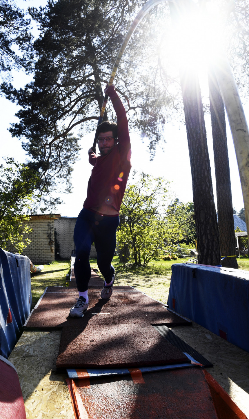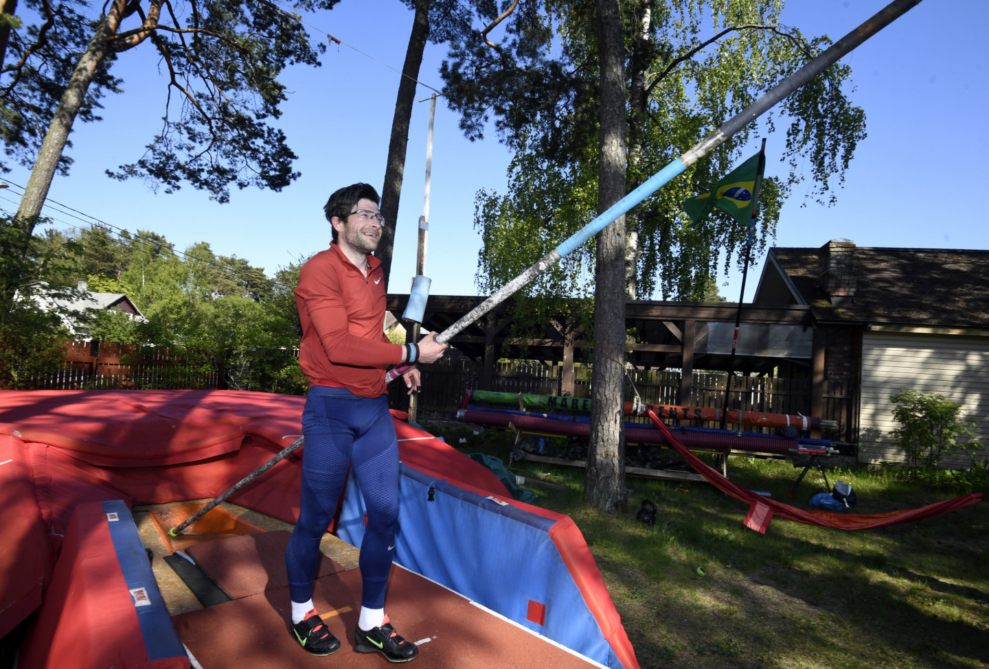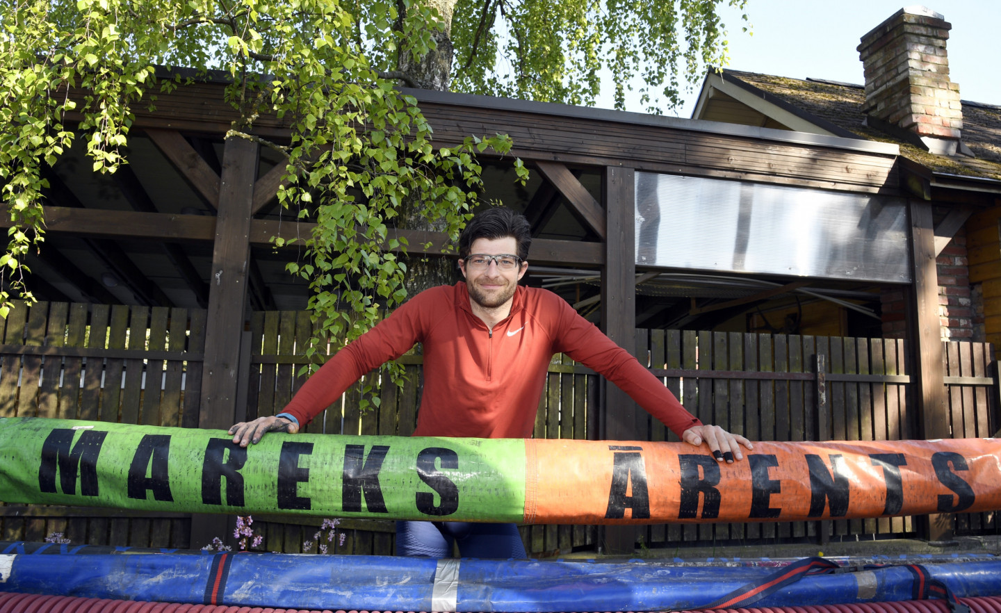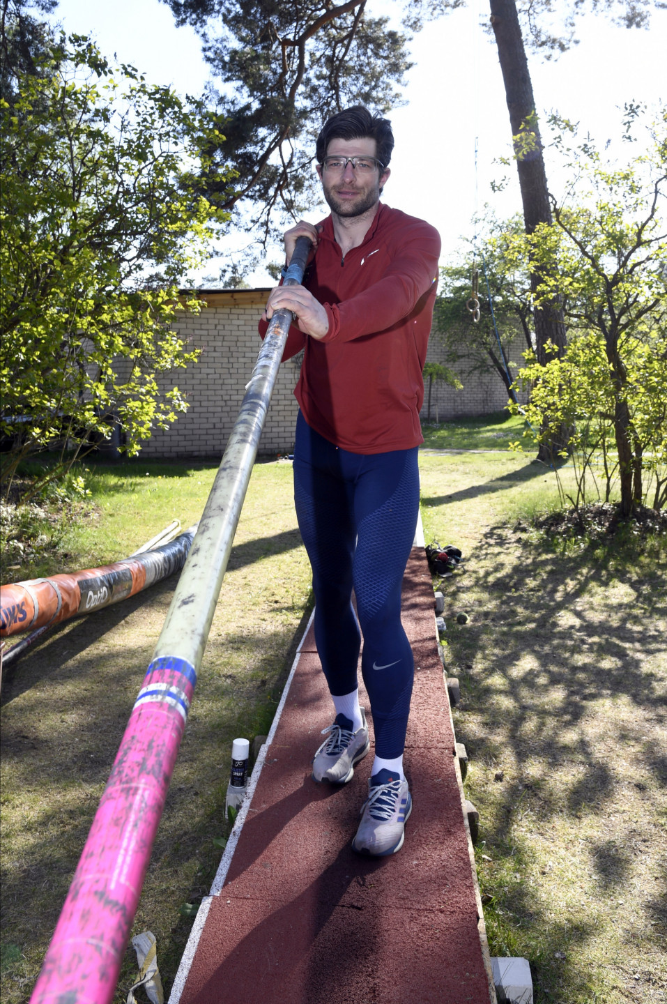 Kārtslēcējs Mareks Ārents Covid-19 pandēmijas laikā trenejas savas mājas pagalmā Saulkrastos.