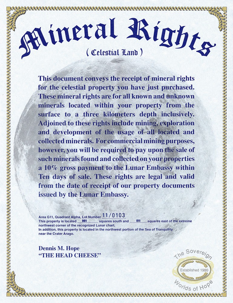 Pirms gandrīz desmit gadiem iegūtais «sertifikāts» Mēness akra (4046,86 kvadrātmetri) īpašniecei apliecina, ka «jums pieder tiesības uz visiem zināmajiem un nezināmajiem minerāliem un izrakteņiem jūsu iegādātajā īpašumā 3 kilometru dziļumā». Ar piebildi – ja izmanto savām vajadzībām. Ja gribētu Mēness izrakteņus izmantot komerciāliem mērķiem, nāktos maksāt 10 procentus no ienākumiem Mēness vēstniecībai. Tā, redz.