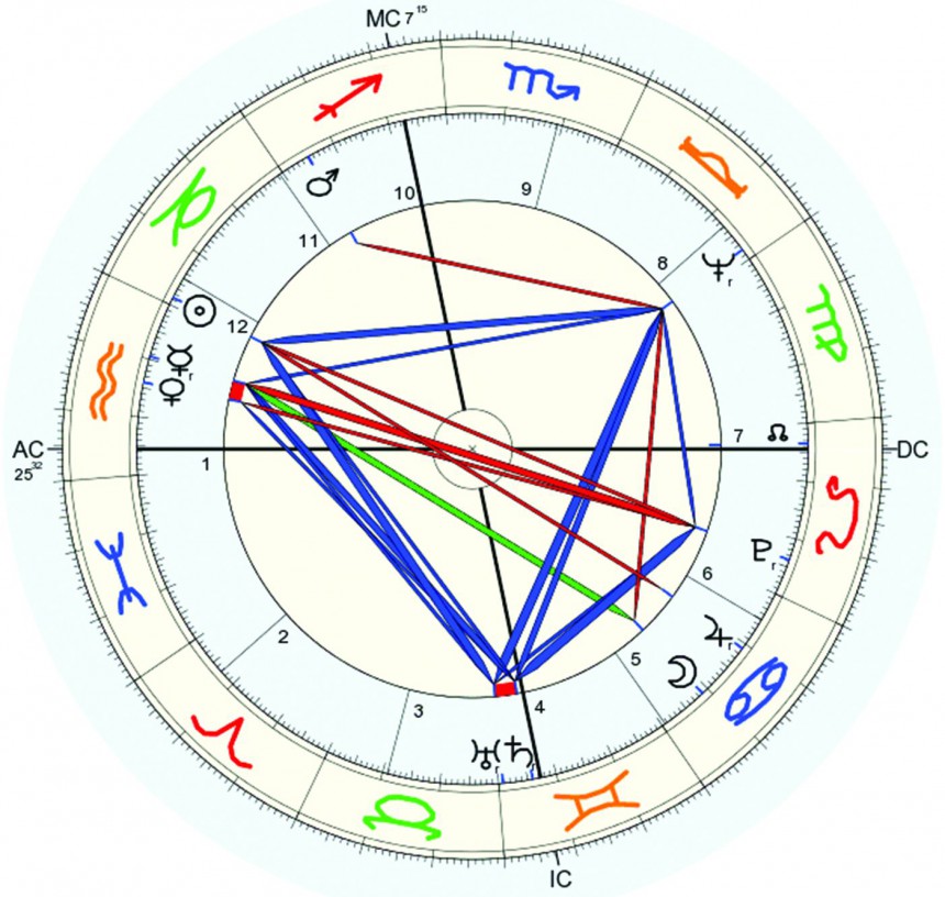 Spilgtu un daudz sasniegušu personību kartēs bieži vien sastopamas vairākas aspektu konfigurācijas vienlaikus. Tam piemērs ir arī rakstniece un filosofe Jeļena Rēriha (1879–1955), gleznotāja Nikolaja Rēriha sieva un «Dzīvās ētikas» grāmatu autore. Jeļenas jeb Helēnas Rērihas natālajā kartē ir vairākas trinu kombinācijas – divi mazie trini, lielais trins, 4 Buras (aspektu figūra, ko veido dažādmalu trijstūris, kam vienā malā ir opozīcijas aspekta līnija, bet pārējās divās – trigons un sekstils. Tiek uzskatīts par visumā veiksmīgu kombināciju, jo tajā ir gan harmoniskie, gan attīstībai nepieciešamais dinamiskais aspekts) un arī divi dinamiski un spriedzes pilni T kvadrāti. Bagātīga karte, kas dāvā tās saimniecei intensīvu, iespējām bagātu dzīves gājumu. Šāda figūru kombinācija dod lielu ārēju elastīgumu savienojumā ar iekšēju noturību. Neapšaubāmi talantīga cilvēka karte.