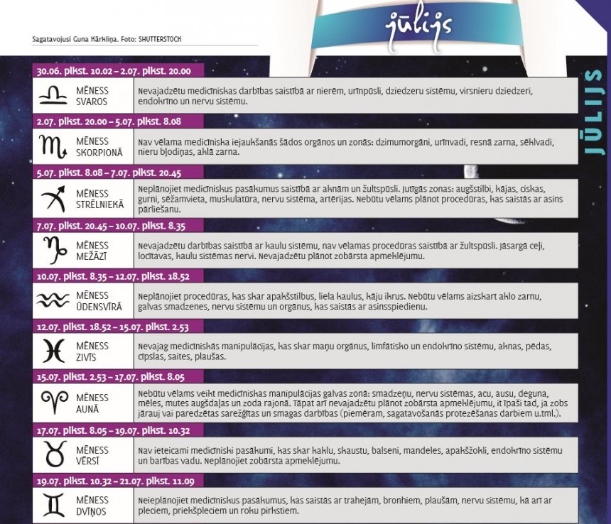 Mēness Svaros - no 30.06. plkst. 10.02 līdz 2.07. plkst. 20.00 Nevajadzētu medicīniskas darbības saistībā ar nierēm, urīnpūsli, dziedzeru sistēmu, virsnieru dziedzeri, endokrīno un nervu sistēmu.