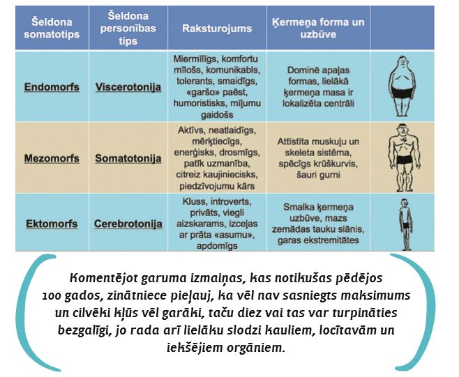 Cilvēki kā personības ir dažādi un unikāli katrs savā ziņā, taču viņiem ir arī daudz kopēja – tas attiecas arī uz fiziskajām īpatnībām. Jau senatnē Hipokrāts bija ievērojis, ka konkrētas ķermeņa veidola pazīmes ir saistītas ar noteiktām slimībām. Taču līdz zinātniskam ķermeņa tipu iedalījumam jeb somatotipiem un to saikni ar raksturu, temperamentu un slimībām nonāca vien 20. gadsimtā. Lai gan laiks ir gājis uz priekšu, taču šajā jomā vēl joprojām ir daudz mīklu, atzīst Latvijas Universitātes Bioloģijas fakultātes Cilvēka un dzīvnieku fizioloģijas katedras vadītāja Līga Ozoliņa-Molla.