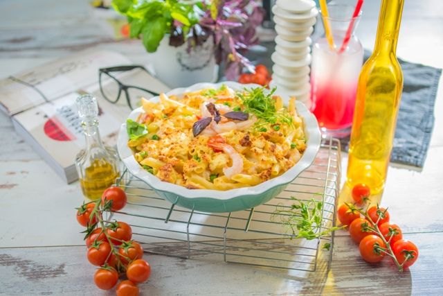 3. Makaronus nokās, jauc kopā ar kausēto sieru, garnelēm, ķiršu tomātiņiem. Klāt pievieno Rimi zirnīšus un kukurūzu;