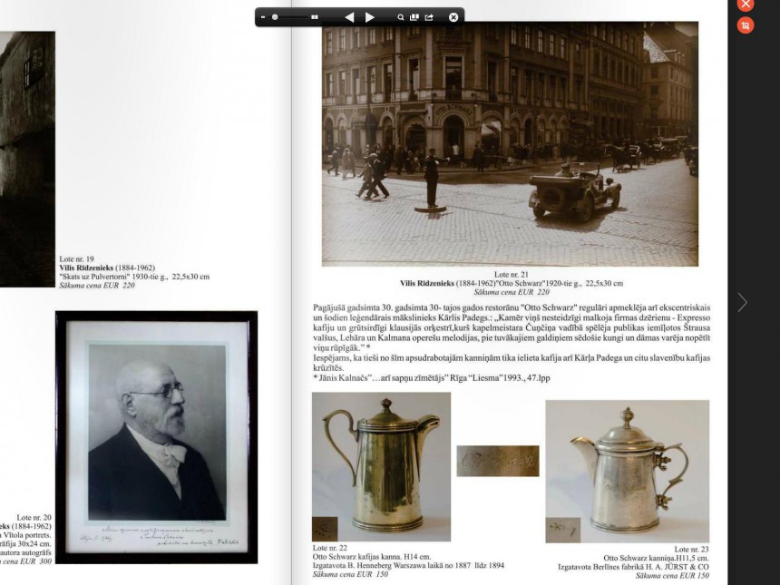 Leģendārās viesnīcas «Hotel de Rome» interjera priekšmeti – restorāna «Otto Schwarz» trauki, Viļa Rīdzinieka un Roberta Johansona Rīgas skatu fotogrāfijas, akvareļi, skulptūras, gleznas, grafika, porcelāns – tas viss 2. oktobrī tiek izsolīts galerijā «Birkenfelds».
