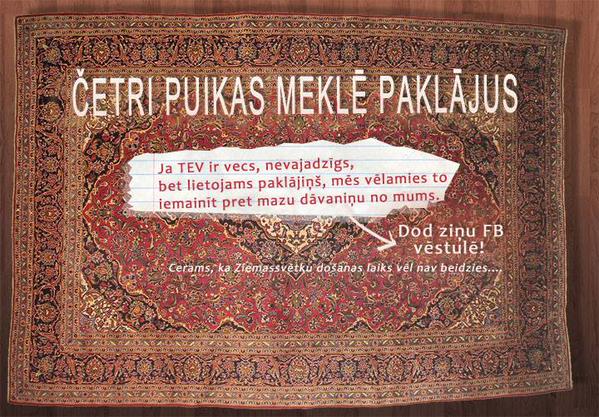 Sociālajos tīklos latviešu jaunie talanti "Carnival Yout" izplatījuši visai neparastu lūgumu- iemainīt vecus, "labā formā" esošus paklājus pret īpašām "dāvaniņām".