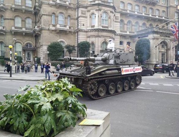 Britu raidorganizācijas BBC birojā ar tanku nogādāta nepilna viena miljona cilvēku parakstīta petīcija par Džeremija Klārksona atjaunošanu auto raidījuma "Top Gear" vadītāja amatā, ziņo independent.co.uk