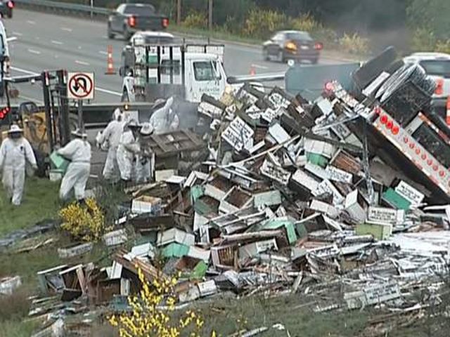 Auto, kura krava bija vairāki miljoni bišu, apgāzās. Vairākas no kastēm, kurās katrā bija pa 5000 bitēm, tika sabojātas.