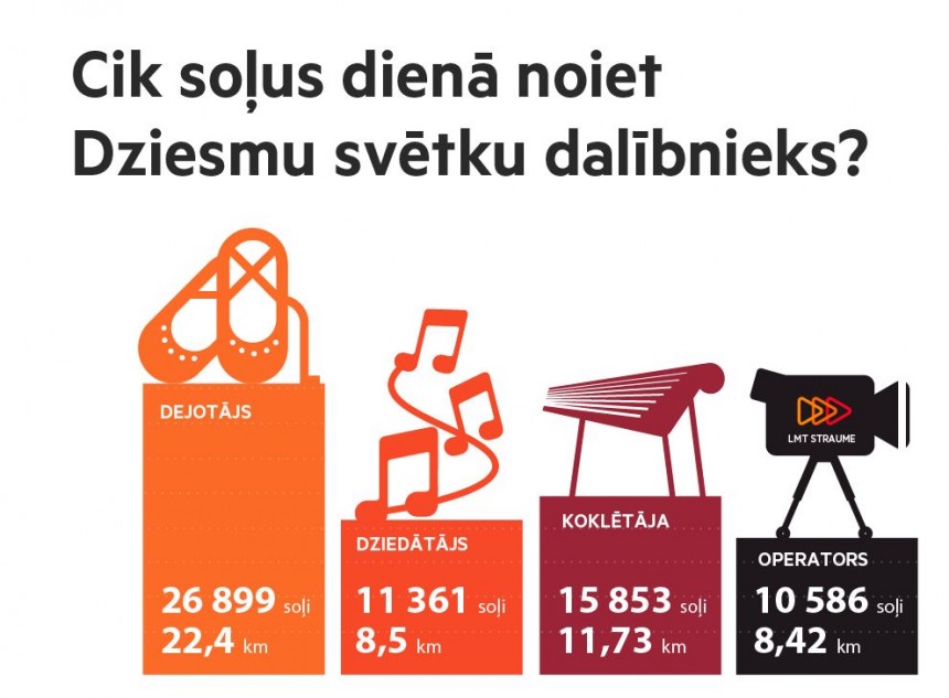 Iegūtie rezultāti liecina, ka dejotājs dienā sper gandrīz 27 000 soļu jeb nodejo un noiet vairāk nekā 22 kilometrus. Dziedātājs krietni mazāk – nedaudz vairāk kā 11 000 soļu, kas kilometru izteiksmē ir 8,5, bet koklētāja noiet gandrīz 16 000 soļu (gandrīz 12 kilometri).