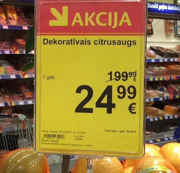 Cenā norādīts, ka ar atlaidi, no 199.99 eiro tikai pa 24.99 eiro gabalā iespējams iegādāties “dekoratīvo citrusaugu”. Diemžēl, redzams, ka šī cenu zīme novietota virs groza ar pavisam parastiem pomelo augļiem. Bildes autors attēlu papildinājis ar ierakstu: “Kļūda, vai dzīves veiksmīgākais un vajadzīgākais pirkums?"
