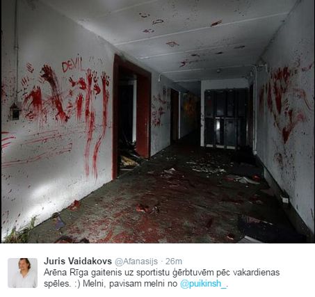 Sociālajā tīklā twitter izplatīts fotoattēls, kurš ataino to kā varētu izskatīties gaitenis pēc vakardienas Rīga DINAMO - Sanktpēterburgas SKA spēles.