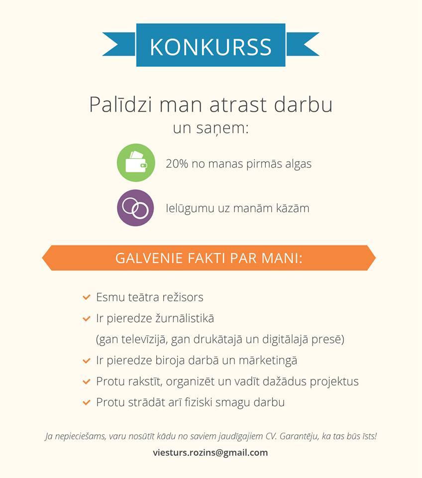 "Šobrīd pēc darba sludinājumu izķemmēšanas, 1564 CV uzcepšanas, tai skaitā izmēģinot izgudrot jaunas, pieprasītas un jaudīgas profesijas, grādus un pieredzes, tāpat izspēlējot 80 lomas darba intervijās, ķeros pie pēdējā salmiņa – facebook!
