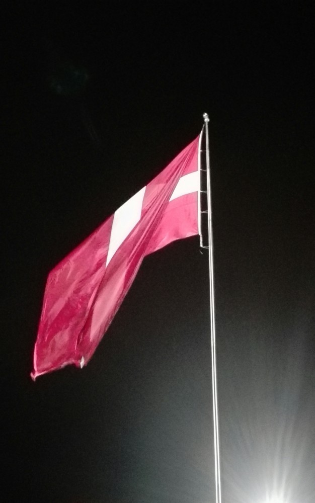 Attēlā karogs Ogrē...agrā rīta stundā,kad ielās manāms vien retais,ne vienmēr paceļam acis uz augšu-skrienam.Bet torīt-īpaši cēli,vēja mudināts,modās Latvijas karogs.