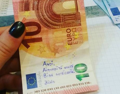 Uz banknotes lasāms: „Andi, aizvadītā nakts bija satriecoša! Jānis”