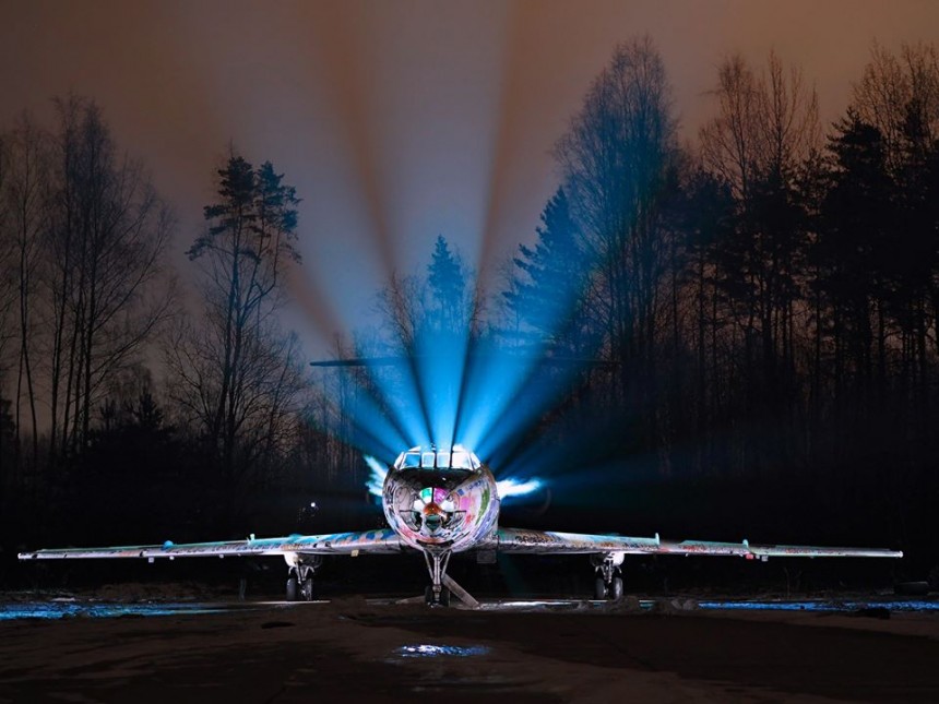 Divi fotogrāfi iemūžinājuši iespaidīgus foto ar Skultē pamesto lidmašīnu naktī.