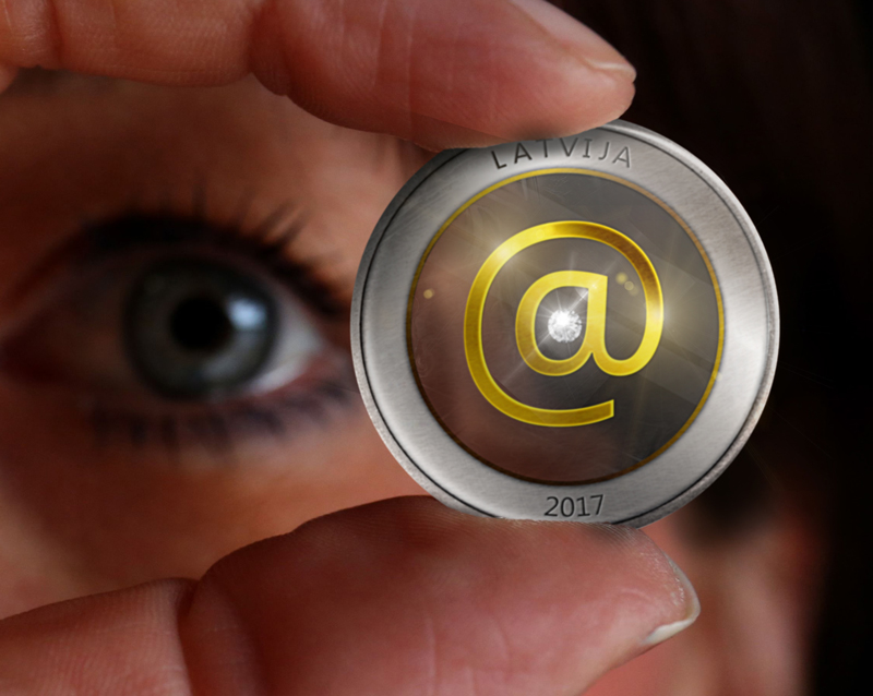 Jaunās kolekcijas monētā iekaltajā @ zīmē iestrādāts 0,03 karātu briljants, kas simbolizē, cik augstu mūsdienās tiek vērtētas digitālās prasmes. Tā kā Latvijā ir ļoti maz zelta atradņu, šī monēta tiek izlaista minimālā daudzumā - 200 eksemplāros, un ir jau ieinteresējusi kolekcionārus visā pasaulē.Tās dizaina idejas izstrādē piedalījās pašmāju augsto tehnoloģiju kompanijas Inbox.lv vadošie IT speciālisti.