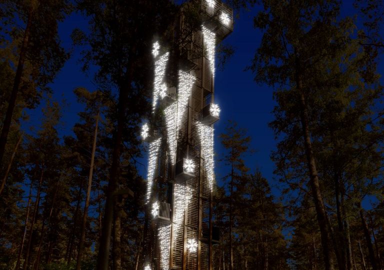 Dzintaru mežaparka 33,5 metrus augstajā skatu tornī iemirdzēsies no gaismas dekoriem veidotas sniegpārsliņas un sniega sanesumi kāpās. Sniegpārsliņas un sniega kupenas klās arī parka priežu zarus. Par unikālu gaismas dekoru - arku - pārtaps parka tiltiņš. Arka ir veidota jūras viļņa formā, tās veidošanā izmantotas LED gaismu virtenes kopumā 3,5 km garumā. Košās krāsas, mirdzuma efekts un neparastās formas sola pārsteiguma sajūtu - it kā atrastos zem milzīga mutuļojoša viļņa. Bērnu rotaļu laukumus un pārējo parka teritoriju “apdzīvos” Ziemassvētku rūķi un zaķi.