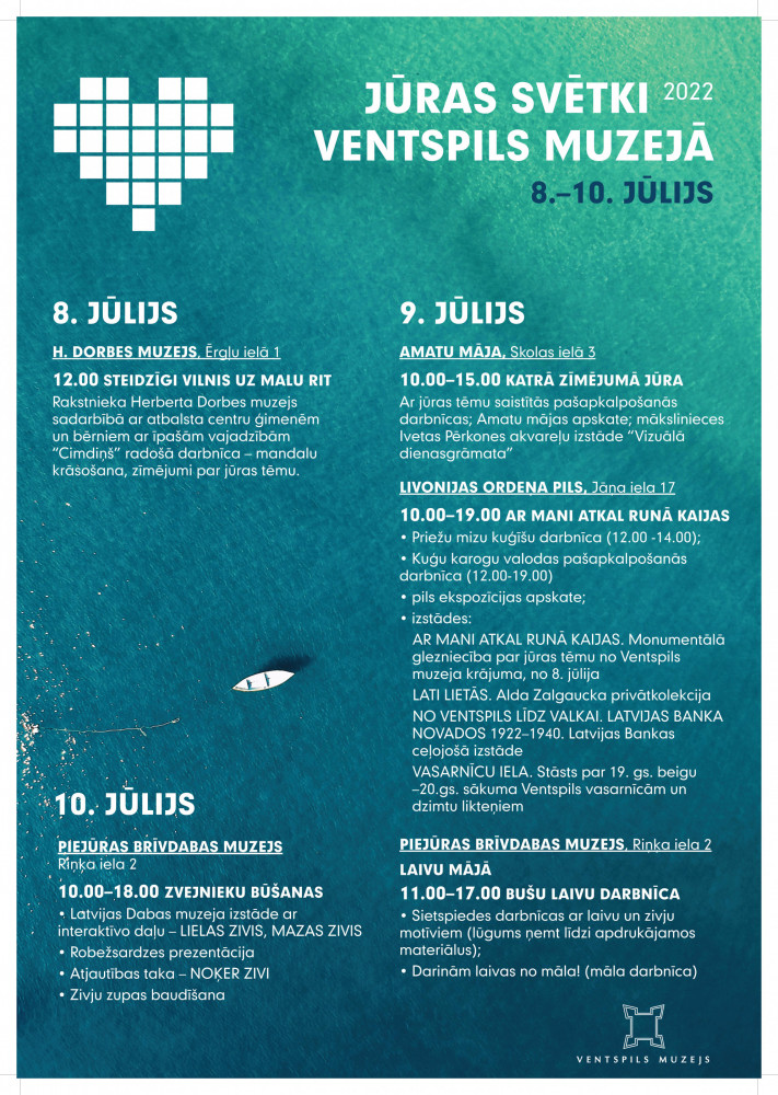 Jūras svētki ar devīzi „Jūra. Mīlestība. Spēle” ienāk Ventspils muzejā un no 8.-10. jūlijam muzeja apmeklētājiem ir iespēja piedalīties muzeja sagatavotajās tematiskajās darbnīcās, apmeklēt izstādes, iepazīties ar robežsargu darbu un pat nobaudīt zivju zupu.