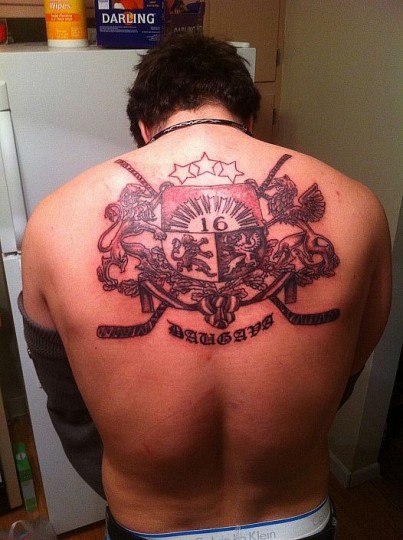 Latviešu hokejists Kaspars Daugaviņš šonedēļ plašākai sabiedrībai atrādījis nesen tapušu tetovējumu – uz sportista muguras uztetovēts milzīgs Latvijas ģerbonis un hokejista iesauka Daugava.