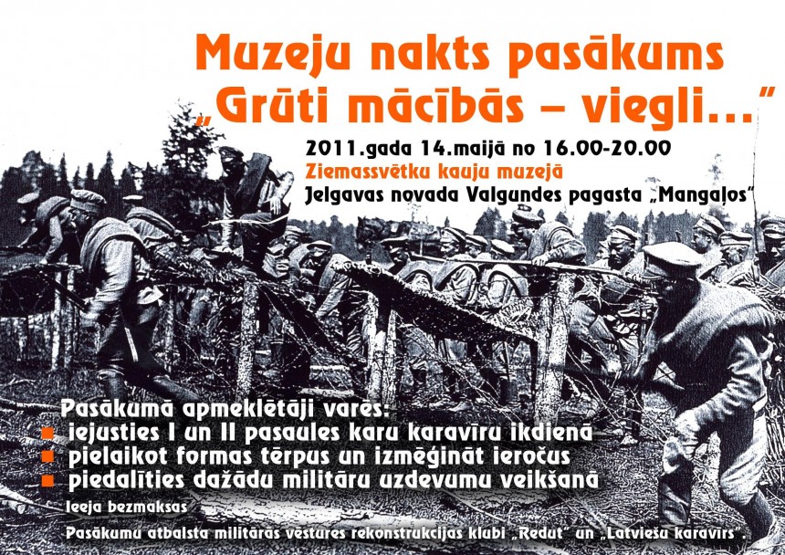 Starptautiskās Muzeju nakts pasākumu ietvaros 2011.gada 14.maijā no 16.00-20.00 Ziemassvētku kauju muzejā Jelgavas novada Valgundes pagasta „Mangaļos” notiks Muzeju nakts pasākums „Grūti mācībās – viegli...”