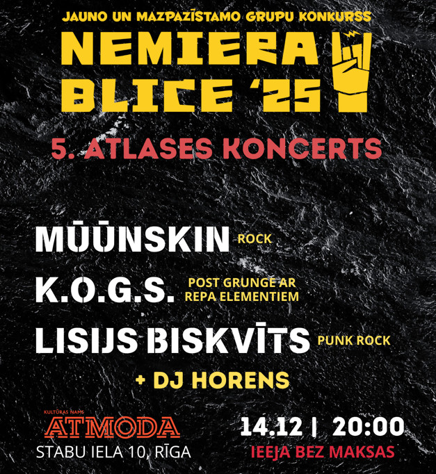 Šo sestdien, 14. decembrī, Kultūras nams “Atmoda” aicina uz jauno un mazpazīstamo grupu konkursa “Nemiera blice 2025” pirmās kārtas piekto koncertu, kurā spēkiem mērosies grupas “Mūūnskin”, “K.O.G.S” un “Lisijs Biskvīts”.