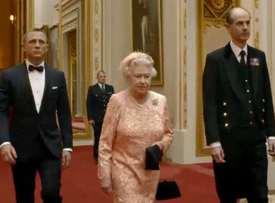 Pēc tam viņa kopā ar Bondu dodas uz helikopteru, kas pēc īsa lidojuma pār naksnīgo Londonu parādās virs olimpiskā stadiona, kur karaliene no tā izlec ar izpletni.