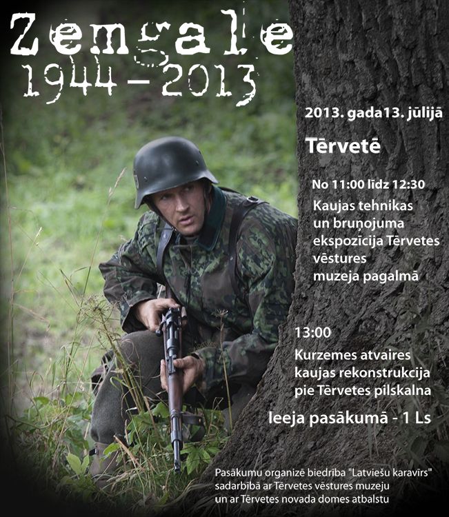 No plkst. 11.00 līdz 12.30 Tērvetes vēstures muzeja pagalmā (aiz Tērvetes estrādes) būs apskatāma kaujas tehnikas un bruņojuma ekspozīcija, savukārt plkst. 13.00 visi interesenti varēs vērot 1944. gada Kurzemes kaujas rekonstrukciju, kura norisināsies pie Tērvetes pilskalna.