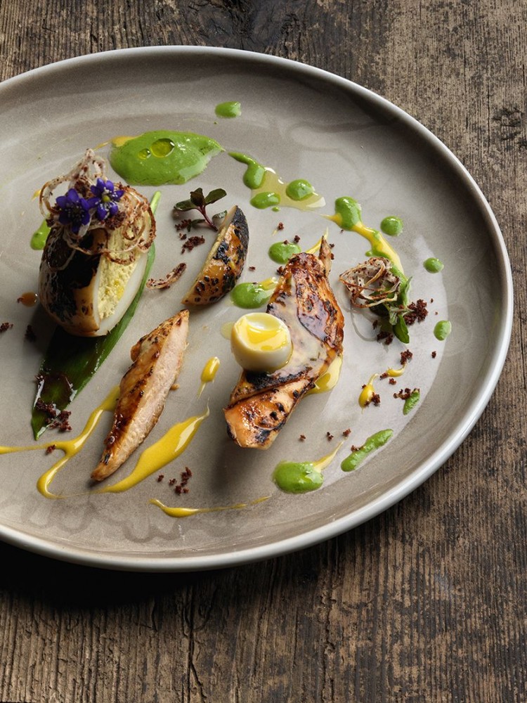 Pavasara cāļa filejas ar sildītu estragona biezpienu pasniegta ar riekšavu zaķskābeņu, paipalas olu un jauno lociņu emulsiju.