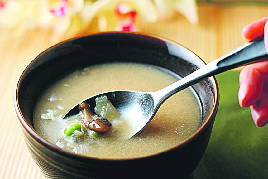 Pagatavošana: katlā ielej mērcējamo ūdeni, pielej klāt tīru; uzvāra, nogriež uguni līdz minimumam, uzliek vāku, vāra 25 minūtes. Pievieno sīpolu, sēnes un burkānus; uzvāra, samazina uguni, uzliek vāku un vāra vēl 15 minūtes. Pagaršo grūbas – ja mīkstas, pievieno selerijas, šķīdinātu miso pastu (parasti šķīdina jau gatavā zupā) un patur karstu vēl 5 minūtes (kad miso pasta ir ielieta, vārīt vairs nedrīkst). Lej šķīvī, pārkaisa ar zaļumiem un pasniedz.