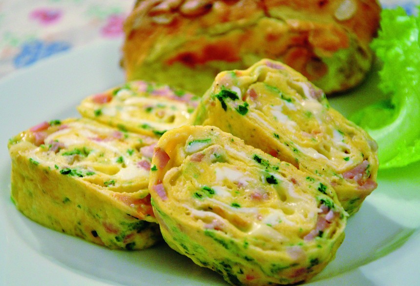 olas sakuļ ar sāli un pipariem, pievieno sakapātus zaļumus, strēmelītēs sagrieztu šķiņķi un rīvētu sieru. Lej pannā sakarsētā sviestā un, apgrozot no abām pusēm, izcep.