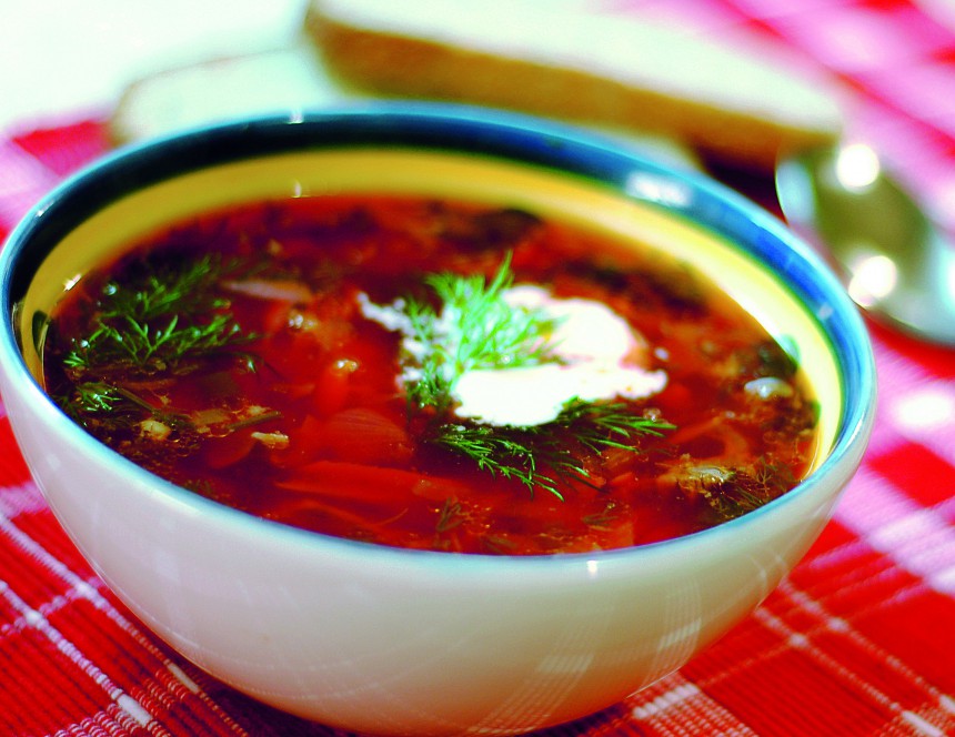 PAGATAVOŠANA: aukstā ūdenī noskalo liellopa kaulus, applaucē ar karstu ūdeni. Kaulus liek katlā, aplej ar aukstu ūdeni un izvāra buljonu. Izņem kaulus, buljonu nokāš un atkal liek uz uguns. Kad buljons uzvārījies, tajā liek gaļu un vāra, līdz tā gatava, tad izņem un sagriež gabaliņos. Bietes notīra, sagriež salmiņos, apsāla, apslaka ar etiķi, samaisa un liek pannā, kurā izkausēts sviests. Bietes pārkaisa ar cukuru un sautē, līdz pusgatavas. Burkānus, pētersīļu sakni un sīpolus notīra, sagriež salmiņos un apcep sviestā. Verdošā buljonā liek kubiciņos sagrieztus kartupeļus, uzvāra. Pievieno smalki sagrieztus kāpostus un vāra 10 – 15 minūtes. Pievieno bietes, apceptos burkānus, selerijas saknes un sīpolus, tomātu pastu vai trīs gabaliņos sagrieztus tomātus, salmiņos sagrieztu papriku. Pievieno melnos piparus, sāli un maltos piparus. Visu uzvāra, samazina uguni un vāra vēl 5 minūtes. Pašās beigās pievieno sasmalcinātus ķiplokus un sagriezto vārīto gaļu. Noņem no uguns, 20 – 25 minūtes ļauj nostāvēties. Pasniedz ar skābu krējumu un sasmalcinātiem pētersīļiem.