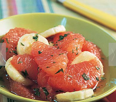 Pagatavošana: bļodā ieber sagrieztu greipfrūtu un banānu. Pievieno piparimētras un medu. Visu sajauc.